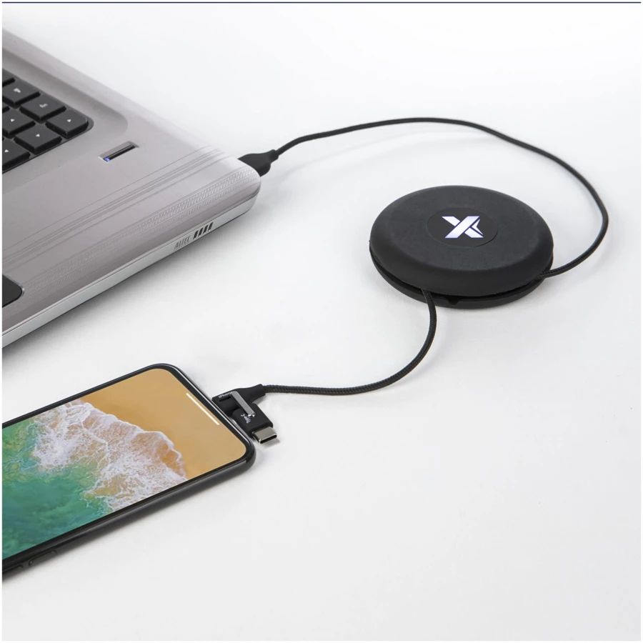 Kabel do ładowania w rolce wyposażony w trzy złącza (typu C, Android, iPhone). Produkt ten umożliwia również przesyłanie danych. Posiada silikonową torbę do przechowywania, dzięki czemu jest to doskonałe akcesorium do zabrania w podróż. Opakowanie wykonane jest z papieru i plastiku z recyklingu.