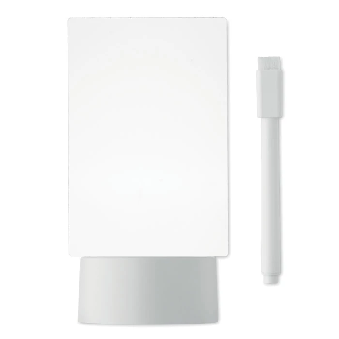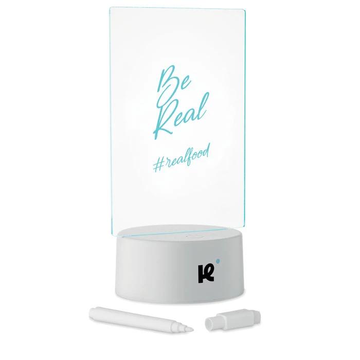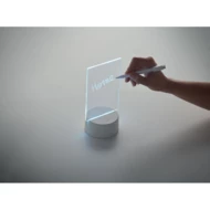 Podświetlana tablica LED ze zmieniającym kolor światłem i zmazywalnym białym markerem. Posiada akrylową tablicę i PS podstawę. Zasilana bateryjnie, wymaga 3 baterii AAA (brak w zestawie).