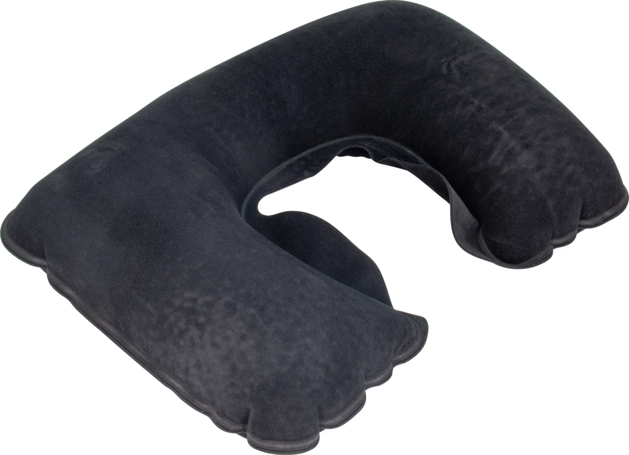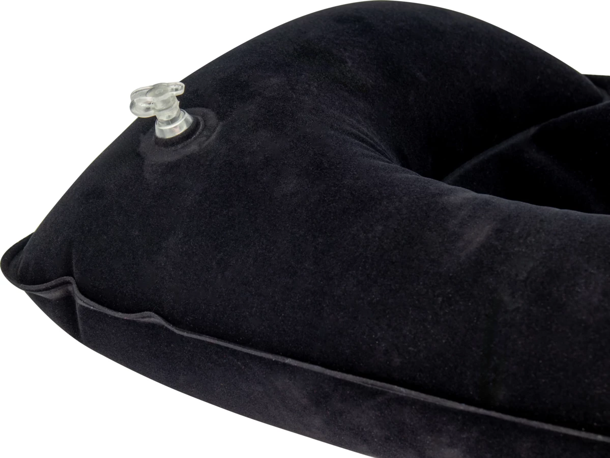 Welurowa, dmuchana poduszka podróżna o ergonomicznym kształcie. Wymiary na płasko: 41,5 x 26,5 cm, wymiary po napompowaniu: 34 x 25 x 10 cm.