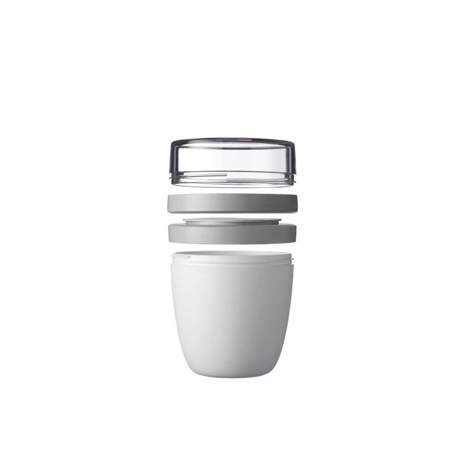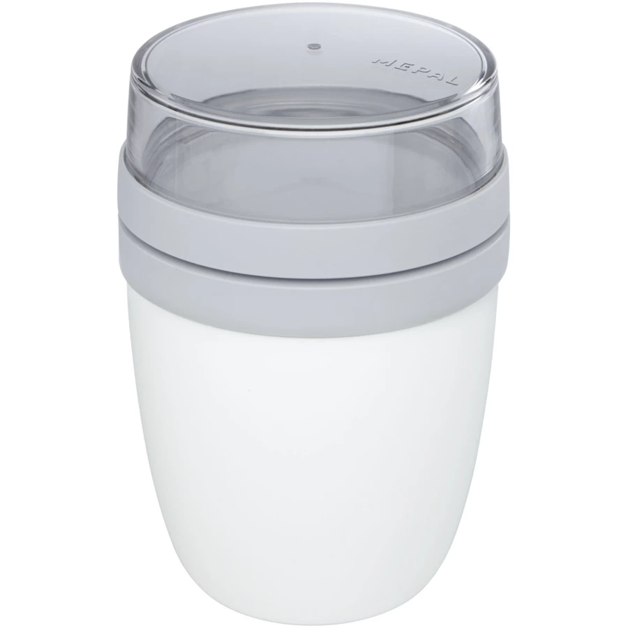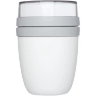 Pojemnik na lunch z dwiema komorami, aby oddzielenie przechowywać różne składniki. Oba pojemniki mają oddzielne pokrywy i dlatego pozostają czyste. Pojemność górnego przezroczystego pojemnika wynosi 200 ml, co oznacza, że może pomieścić około 75 gramów żywności w formie stałej. Pojemność dolnego pojemnika wynosi 500 ml. Wykonane z trwałego materiału, dzięki czemu mogą być przechowywane w zamrażarce oraz stosowane w kuchence mikrofalowej (należy zdjąć pokrywę) i zmywarce. Górnego przezroczystego pojemnika nie należy używać w kuchence mikrofalowej. Wodoszczelne. Nie zawiera BPA.