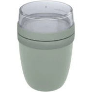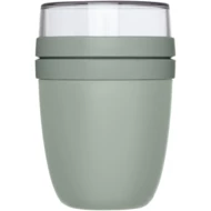 Pojemnik na lunch z dwiema komorami, aby oddzielenie przechowywać różne składniki. Oba pojemniki mają oddzielne pokrywy i dlatego pozostają czyste. Pojemność górnego przezroczystego pojemnika wynosi 200 ml, co oznacza, że może pomieścić około 75 gramów żywności w formie stałej. Pojemność dolnego pojemnika wynosi 500 ml. Wykonane z trwałego materiału, dzięki czemu mogą być przechowywane w zamrażarce oraz stosowane w kuchence mikrofalowej (należy zdjąć pokrywę) i zmywarce. Górnego przezroczystego pojemnika nie należy używać w kuchence mikrofalowej. Wodoszczelne. Nie zawiera BPA.