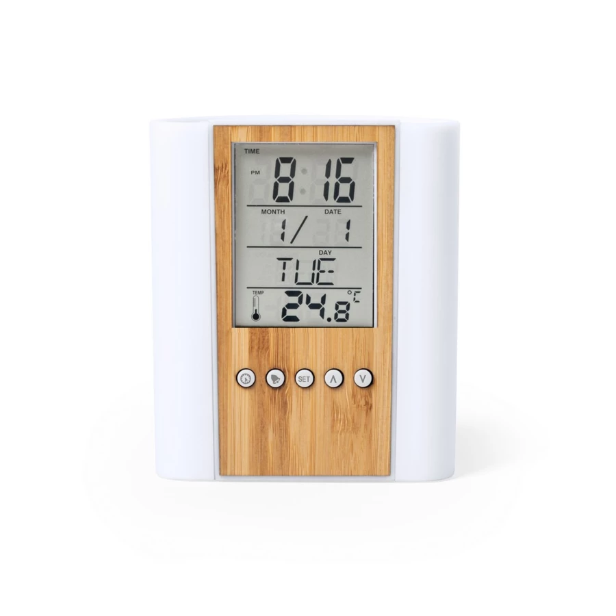 Pojemnik na przybory do pisania, kalendarz, zegar, termometr, alarm (funkcje: minutnik, przypomnienie o urodzinach), bambusowy element