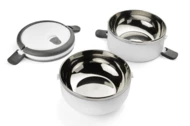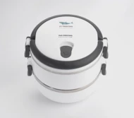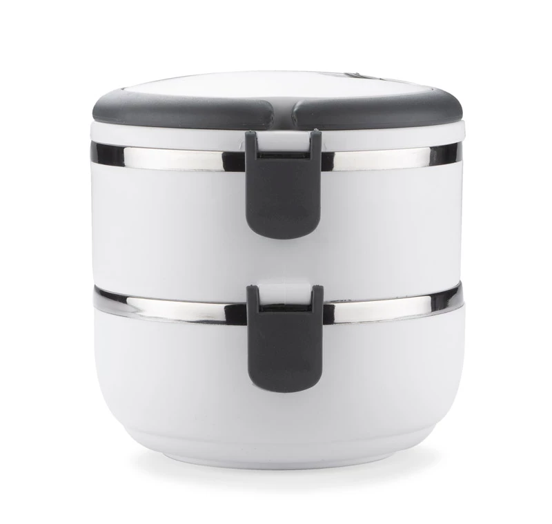 Pojemnik z wnętrzem ze stali nierdzewnej podzielony na dwie komory, które składamy jedną na drugą, co zapewnia poręczne i wygodne przenoszenie dwudaniowych posiłków. Górna komora wyposażona w uszczelkę. Uchwyty z tworzywa sztucznego z możliwością złożenia. Łączna pojemność: 1400 ml.