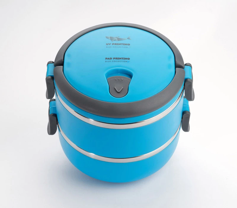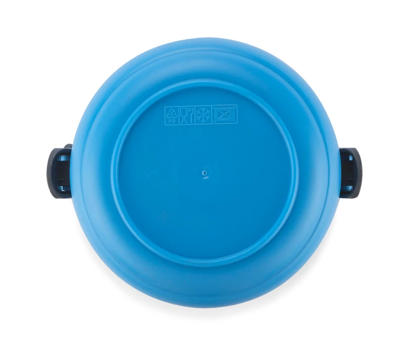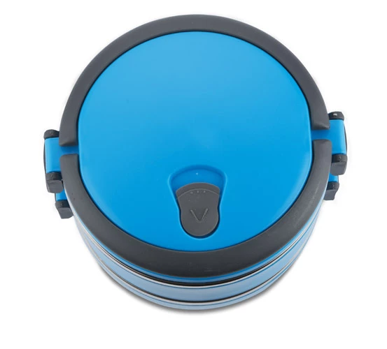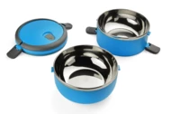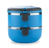 Pojemnik z wnętrzem ze stali nierdzewnej podzielony na dwie komory, które składamy jedną na drugą, co zapewnia poręczne i wygodne przenoszenie dwudaniowych posiłków. Górna komora wyposażona w uszczelkę. Uchwyty z tworzywa sztucznego z możliwością złożenia. Łączna pojemność: 1400 ml.