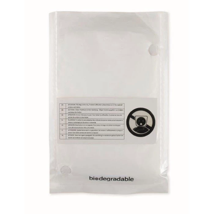 Składane ponczo z materiału biodegradowalnego z kapturem, zapakowane biodegradowalny woreczek.