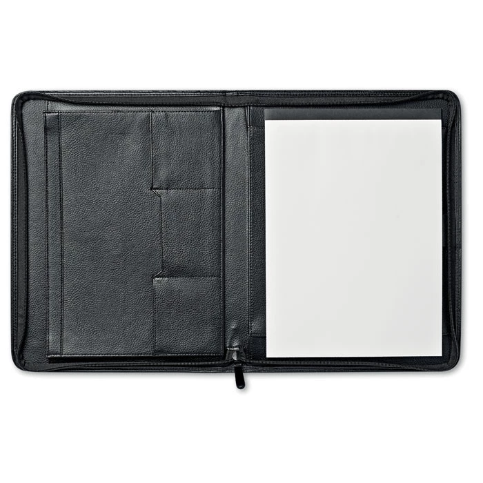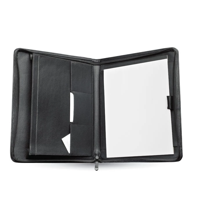 Teczka konferencyjna A4 z okładką z klejonej skóry. Zapinana na zamek błyskawiczny. Notatnik zawiera 25 czystych kartek, 4 wewnętrzne przegródki, uchwyt na długopis.