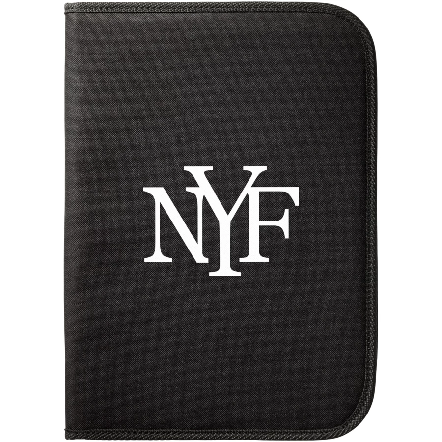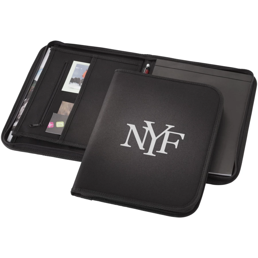 Portfolio zapinane na zamek z kieszeniami na dokumenty oraz 20-kartkowym notesem w linie. Zestaw nie zawiera długopisu i akcesoriów.