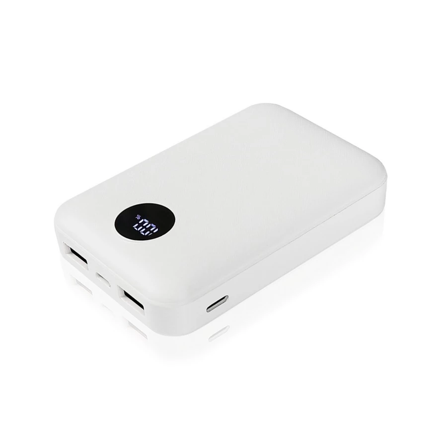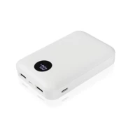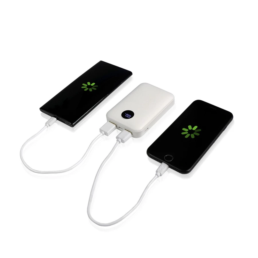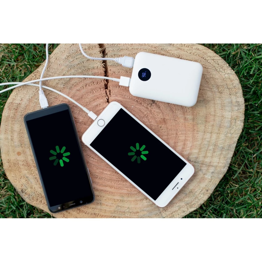 Power bank Air Gifts 10000 mAh, może zmieścić się w kieszeni czy większości przegródek w plecaku, posiada cyfrowy wyświetlacz poziomu naładowania, wejścia 5V/2A: USB-C oraz micro USB, 2 wyjścia USB (max. 5V/2A), możliwość ładowania dwóch urządzeń jednocześnie, w komplecie kabel USB-C oraz filcowe etui z karabińczykiem umożliwiającym przypinanie, produkt wykonany z ABS i filcu