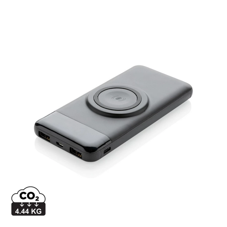 Power bank 10000 mAh, wbudowana ładowarka bezprzewodowa 3W może służyć do naładowania zarówno telefonu jak i smartwatcha, wskaźnik poziomu naładowania, 2 wyjścia USB do ładowania za pomocą kabla, wbudowany akumulator litowo-polimerowy klasy A o dużej gęstości i trwałości, w pełni naładowane urządzenie może naładować telefon do 5 razy, bezprzewodowe ładowanie jest kompatybilne ze wszystkimi urządzeniami posiadającymi możliwość ładowania indukcyjnego, wejście micro USB 5V/2A, wejście USB typu C 5V/2A, wyjście USB 5V/1A, wyjście bezprzewodowe do ładowania telefonu 5V/1A 5W, wyjście bezprzewodowe do ładowania smartwatcha 5V/0.6A 3W, kabel micro USB z TPE bez dodatku PVC w komplecie, ślad węglowy produktu: 4,44 kg CO2