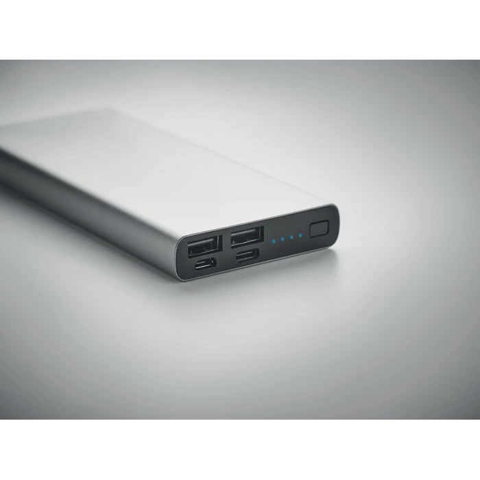 Power bank 10000 mAh z aluminium pochodzącego z recyklingu. Pojemność do smartfonów, prąd wyjściowy DC5V/1A i DC5V/2A. Zawiera lampkę kontrolną i kabel USB z wtyczką micro USB. Obsługuje technologię szybkiego ładowania (18 W). Wejście/wyjście: Typ-C. Obsługa Power Delivery (PD) do ładowania najnowszego laptopa MacPro®.