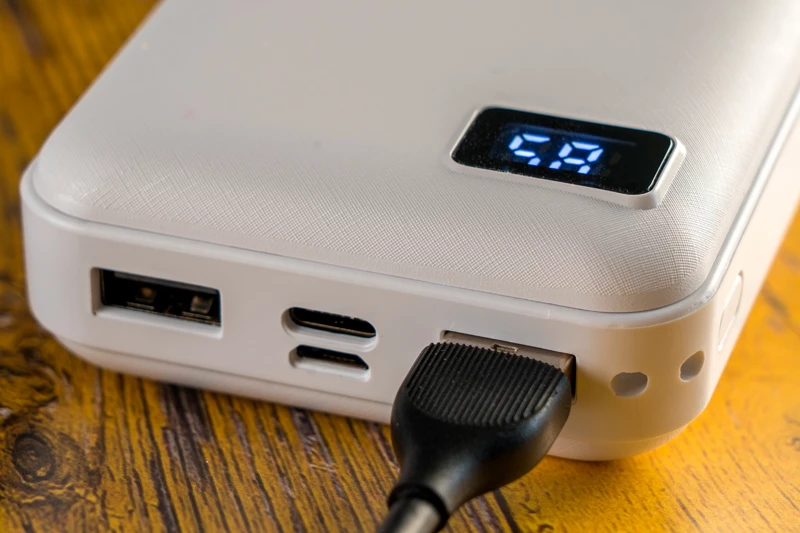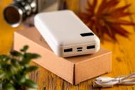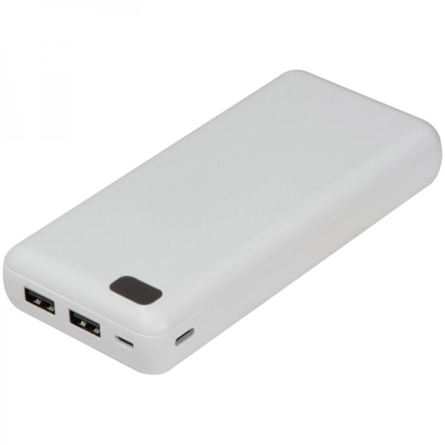 Power bank o pojemności 20 000mAh. Posiada wskaźnik ładowania oraz kabel USB. Dwa wyjścia USB pozwalają na jednoczesne ładowanie dwóch urządzeń. Power bank dostęny w białym kolorze.