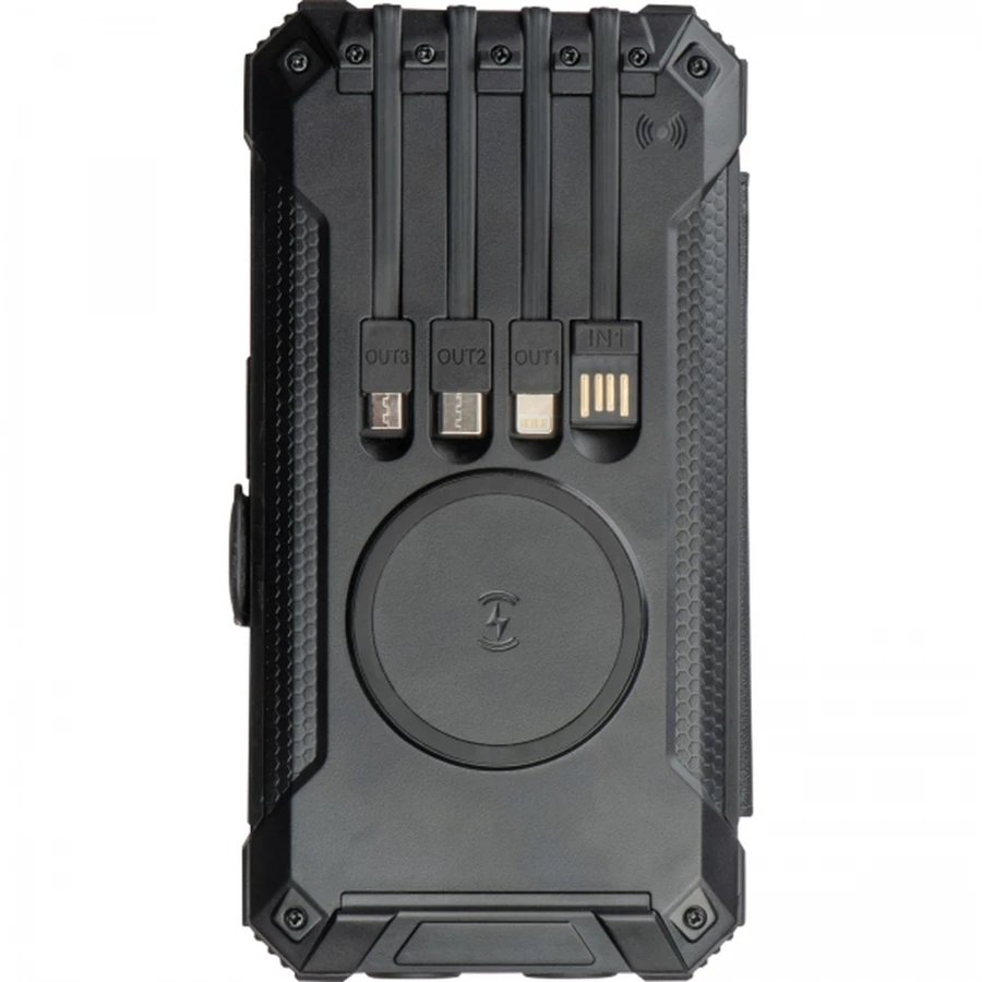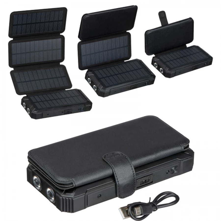 Power bank słoneczny o pojemności 20 000 mAh i czterema rozkładanymi panelami słonecznymi zapewniającymi wydajny pobór energii słonecznej . Dane techniczne: Pojemność: 20000 mAh Micro Input: DC 5V, 2A Output 1: DC 5V, 3A Type-C output: DC 5V, 3A Type-C input: DC 5V, 2A Output 2: DC 5V, 2A Moc ładowania bezprzewodowego: 5W Inne: Dostepne wejścia: USB A, typ C, mikro USB Dostępne kabelki: lighting, typ C, mikro USB, USB Kabelek do ładowania: USB A i typ C