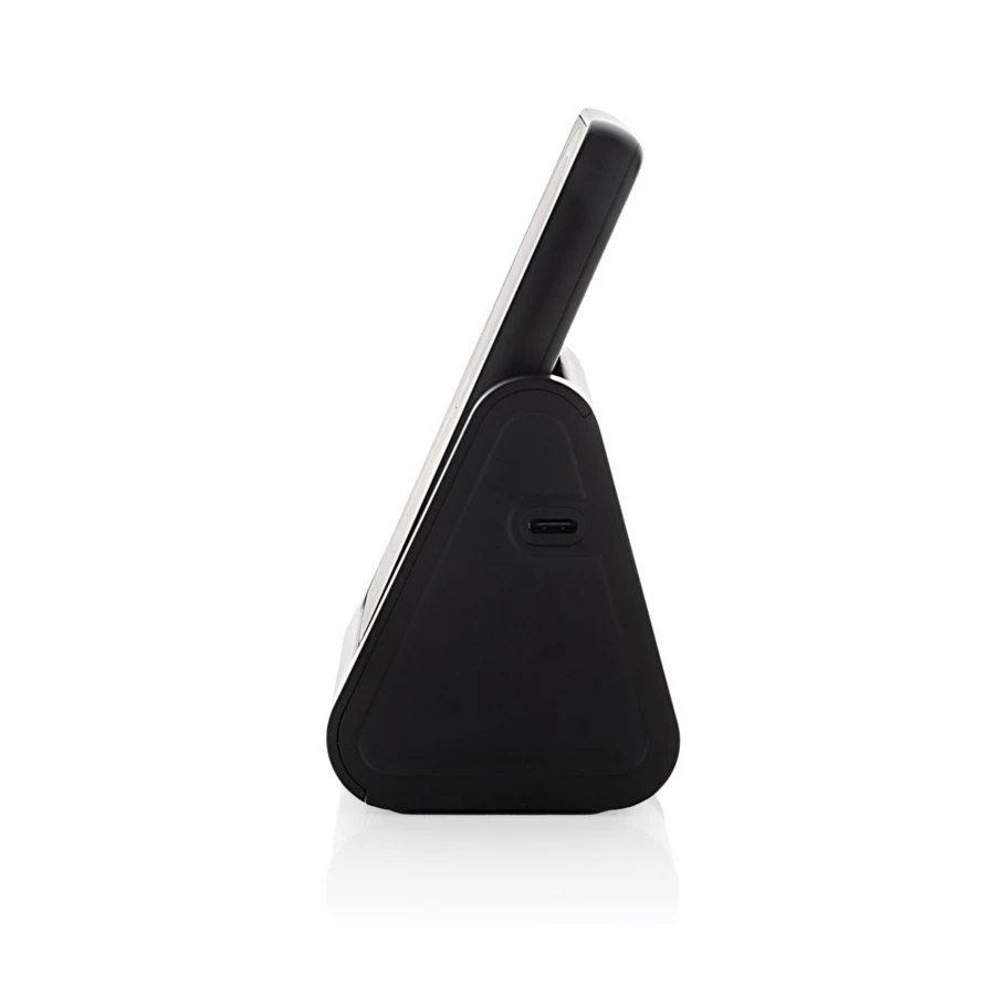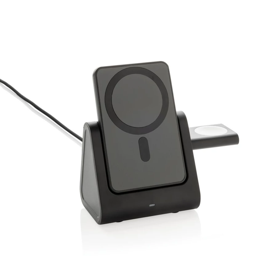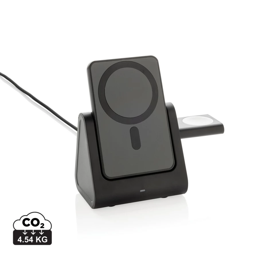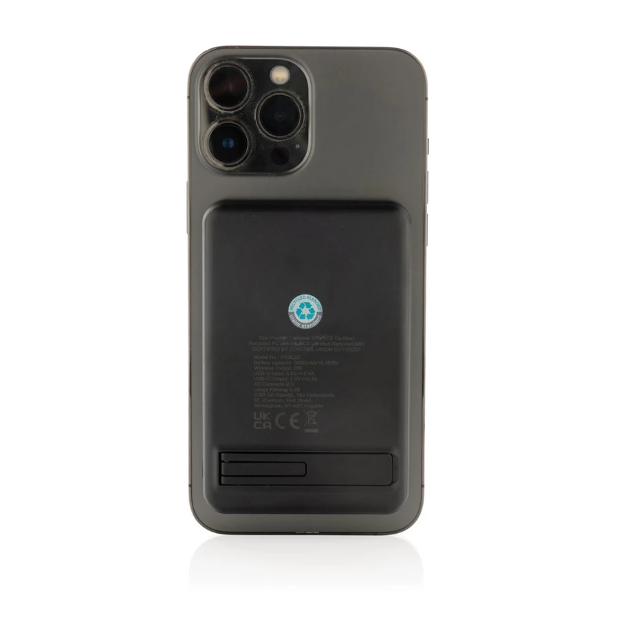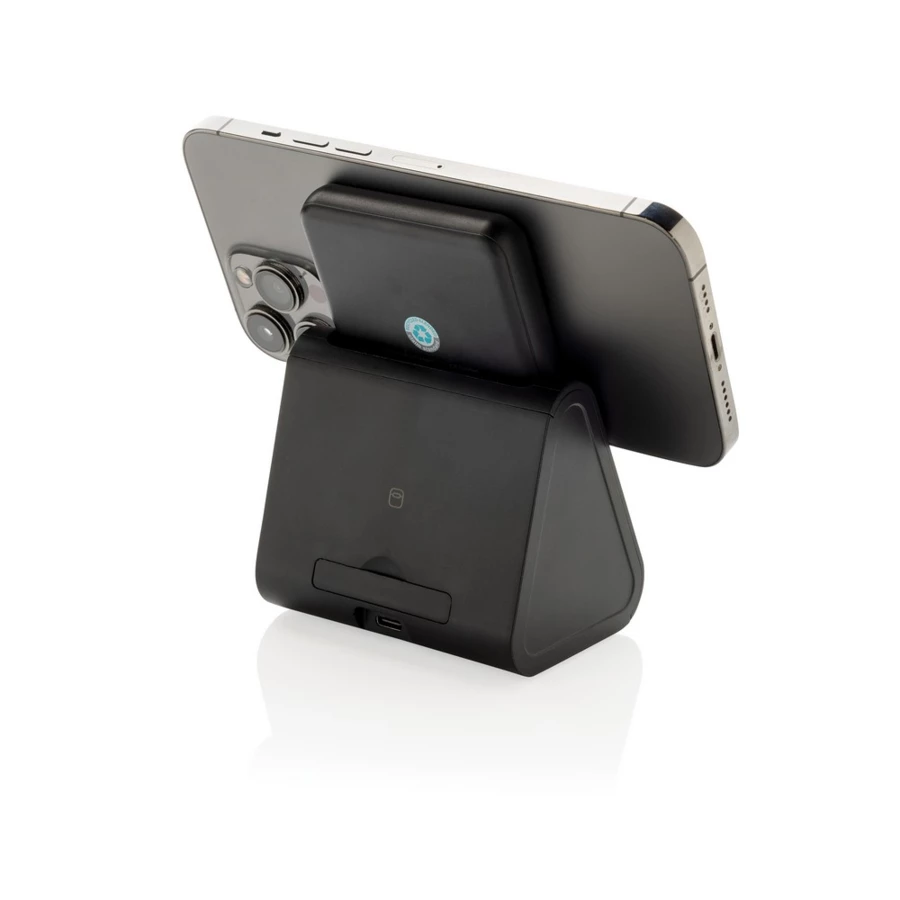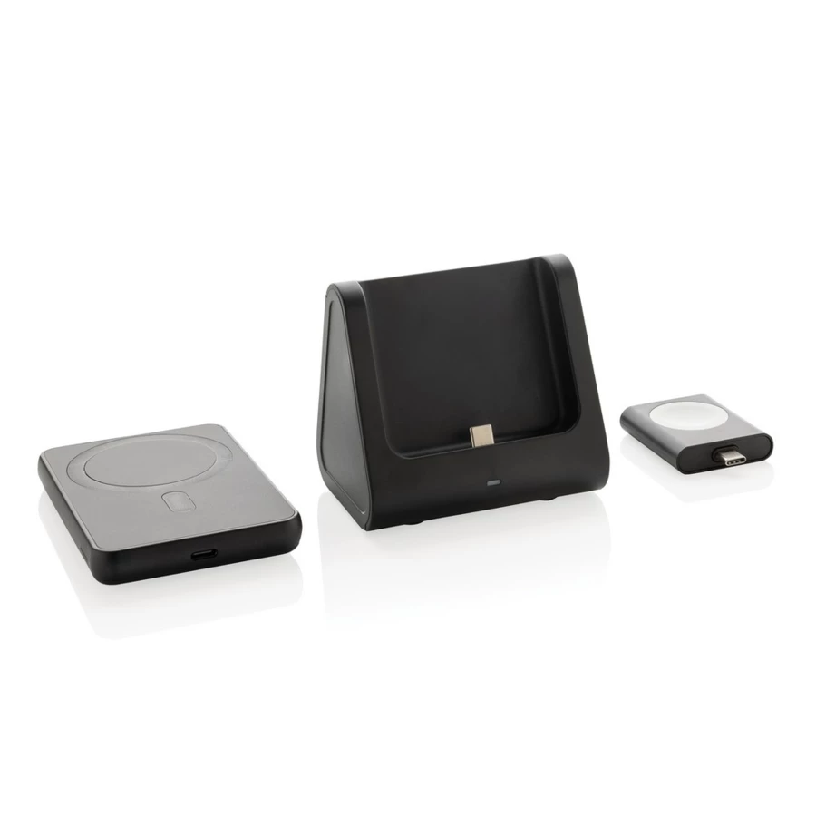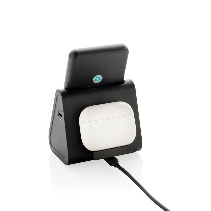 Ładowarka bezprzewodowa 3 w 1, bezprzewodowy, magnetyczny power bank 5000 mAh 5W, stacja dokująca do ładowania power banku, ładowarka bezprzewodowa 5W do słuchawek i drobnych akcesoriów, ładowarka bezprzewodowa 2,5W do smartwatchy (tylko iOS), wykonana z ABS z recyklingu z certyfikatem RCS, działa z telefonami posiadającymi możliwość ładowania indukcyjnego, wejście 5V/2.4A, wyjścia: 5V/1A, 5V/1A, 5V/0.5A, kabel 120 cm z TPE z recyklingu w komplecie, całkowita zawartość materiałów z recyklingu obliczona w oparciu o wagę całkowitą przedmiotu: 59%, w pudełku z certyfikatem FSC® mix