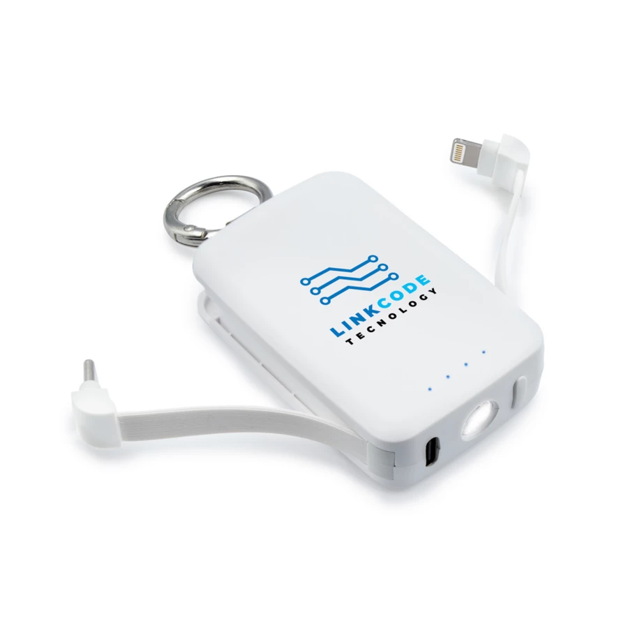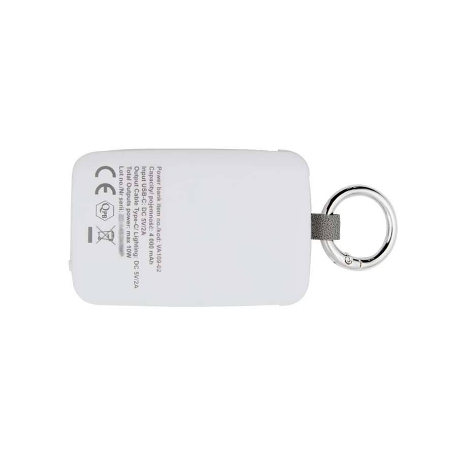 Power bank 4000 mAh z karabińczykiem umożliwiającym przypinanie, może zmieścić się w kieszeni czy większości przegródek w plecaku, posiada wbudowaną lampkę o mocy 1W i 3 trybami świecenia: światło stałe (2 tryby) i światło migające (komunikat typu SOS), światło stałe słabsze, 2 zintegrowane kable: USB-C i z końcówką kompatybilną z urządzeniami iOS co umożliwia jednoczesne ładowanie dwóch urządzeń o różnych złączach, posiada 4 diody wskazujące poziom naładowania, czas działania lampki na 1 cyklu ładowania power banku: > 24h, wejście USB-C, w komplecie kabel USB-C, produkt wykonany z ABS i metalu