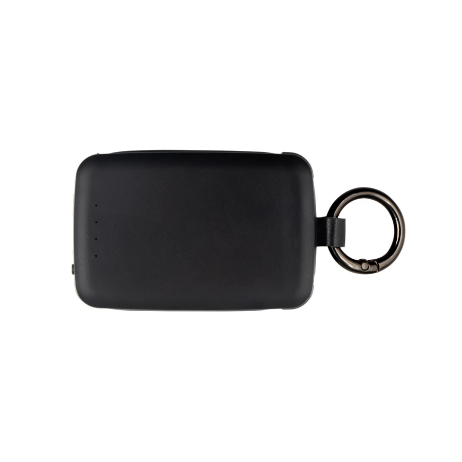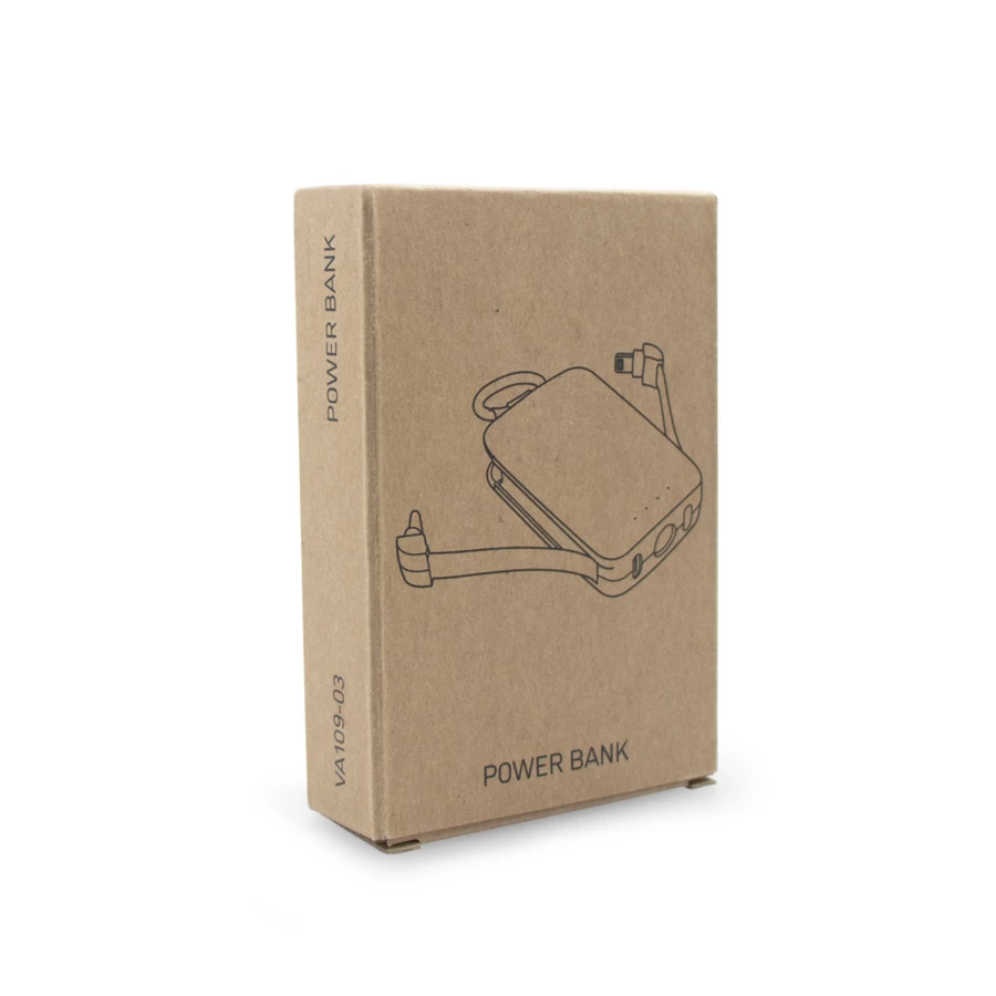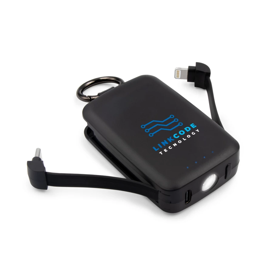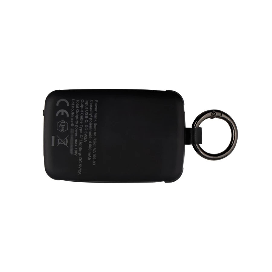 Power bank 4000 mAh z karabińczykiem umożliwiającym przypinanie, może zmieścić się w kieszeni czy większości przegródek w plecaku, posiada wbudowaną lampkę o mocy 1W i 3 trybami świecenia: światło stałe (2 tryby) i światło migające (komunikat typu SOS), światło stałe słabsze, 2 zintegrowane kable: USB-C i z końcówką kompatybilną z urządzeniami iOS co umożliwia jednoczesne ładowanie dwóch urządzeń o różnych złączach, posiada 4 diody wskazujące poziom naładowania, czas działania lampki na 1 cyklu ładowania power banku: > 24h, wejście USB-C, w komplecie kabel USB-C, produkt wykonany z ABS i metalu
