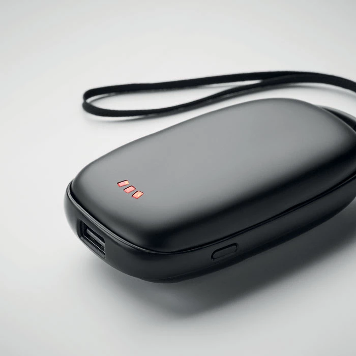 Elektryczny aluminiowy ogrzewacz do rąk z 3 poziomami intensywności (40º, 45º i 50º) i z wbudowanym power bankiem o pojemności 4000 mAh. Zawiera pasek na rękę. Wejście/wyjście: Typ-C. Wyjście USB-A. Wyjście: DC5V/2A. Przewód od Typ-C do Typ-C z adapterem Typ-A.