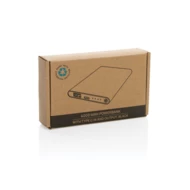Power bank 4000 mAh, wskaźniki poziomu naładowania, wbudowany akumulator litowo-polimerowy klasy A, wykonany z aluminium i ABS z recyklingu, całkowita zawartość materiałów obliczona na podstawie wagi całkowitej przedmiotu: 66%, wejście USB typu C 5V/2A, wyjście USB typu C 5V/2A, wyjście USB 5V/2A, kabel z TPE z recyklingu z certyfikatem RCS w komplecie, w pudełku z papieru z certyfikatem FSC® mix, ślad węglowy produktu: 1,83 kg CO2