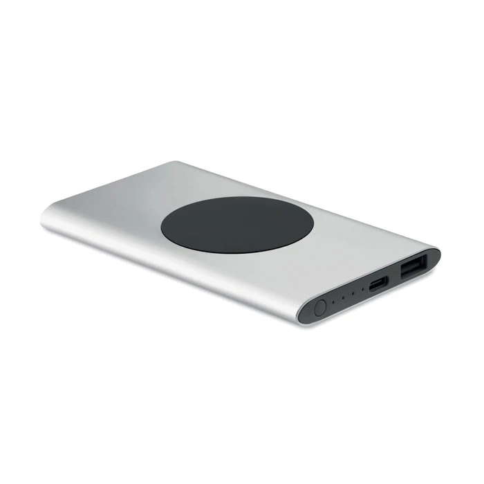 Bezprzewodowy power bank o mocy 15 W i pojemności 5000 mAh wykonany z aluminium pochodzącego z recyklingu. Wejście: Typ-C. Wyjście: 1 x Type-C i 1 x Type-A.