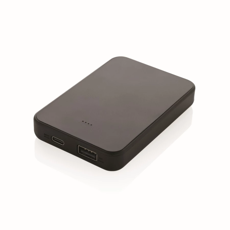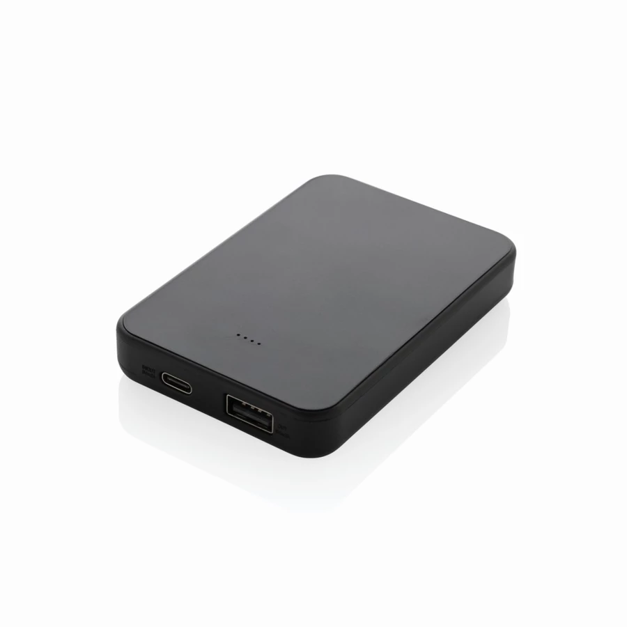 Powerbank o pojemności 5000 mAh z portem wejścia/wyjścia USB typu C i dodatkowym portem USB typu A, obudowa wykonana jest z tworzywa ABS pochodzącego z recyklingu z certyfikatem RCS. RCS (Recycled Claim Standard) to standard weryfikacji zawartości surowców wtórnych w produkcie w całym łańcuchu dostaw, wskaźniki zasilania wskazują pozostały poziom energii, wejście typu C 5 V/2,4 A; USB A: wyjście 5 V/2,4 A, wyjście typu C: 5 V/2 A produkt i akcesoria nie zawierają PVC, w zestawie kabel ładujący TPE z recyklingu z certyfikatem RCS, zapakowane w opakowanie FSC® mix