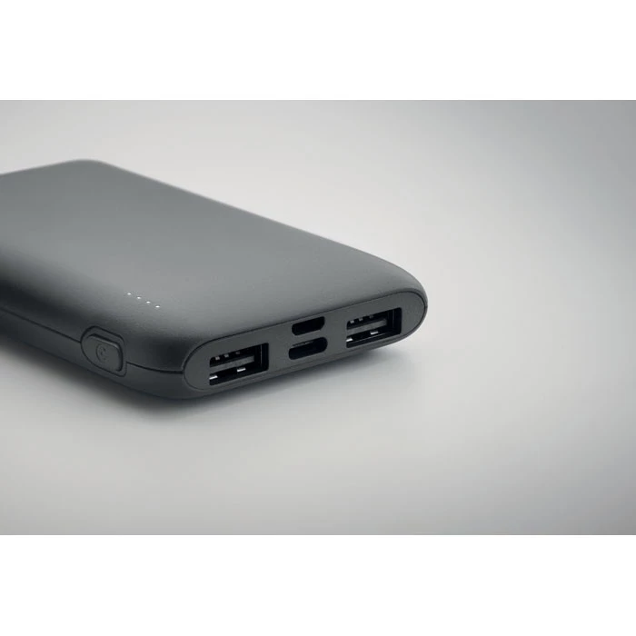 Power bank 5000 mAh z ABS pochodzącego z recyklingu. Pojemność dla smartfonów, Wyjście: 1 x Typ-C, 2 x Typ-A i 1 x Typ-B. Wejście: 2 w 1 typu C i typu A.