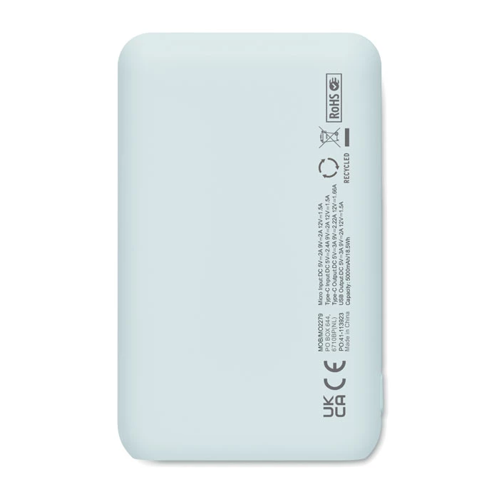 Power bank 5000 mAh z ABS pochodzącego z recyklingu. Pojemność dla smartfonów, Wyjście: 1 x Typ-C, 2 x Typ-A i 1 x Typ-B. Wejście: 2 w 1 typu C i typu A.