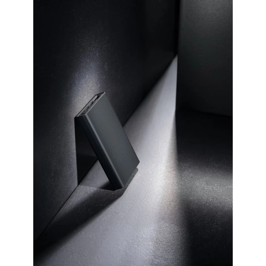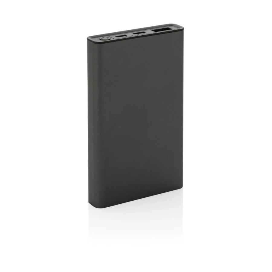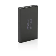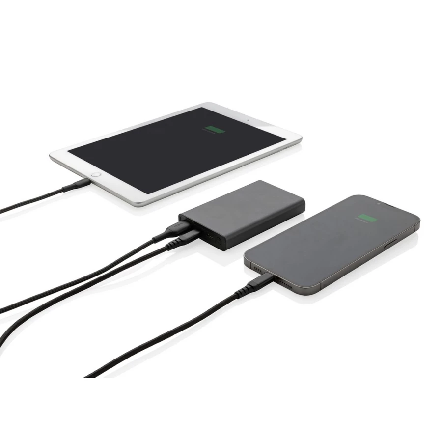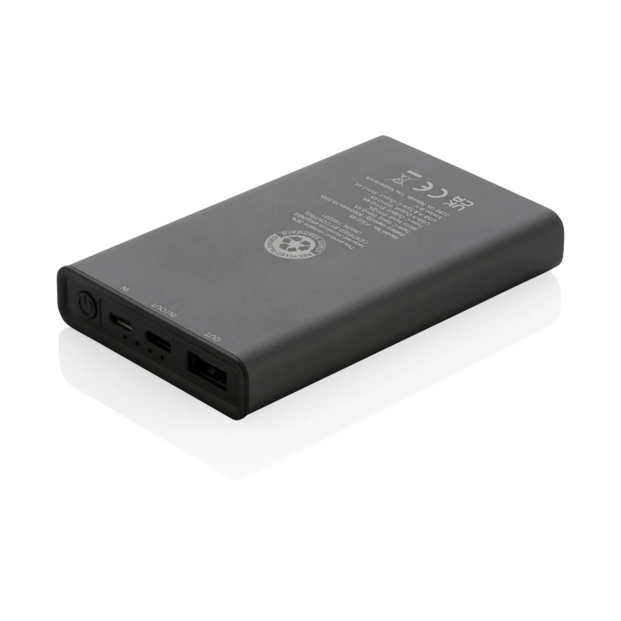 Power bank 5000 mAh, 4 wskaźniki poziomu naładowania, wykonany z aluminium i ABS z recyklingu c certyfikatem RCS, zawartość materiałów z recyklingu obliczona na podstawie wagi przedmiotu 36%, wyjście USB 5/2.4A, wyjście typu C 5 V/2.4A, wejście typu C 2.4A, wejście micro USB 5V/2A, kabel w komplecie, w pudełku z certyfikatem FSC® mix, ślad węglowy produktu: 2,23 kg CO2