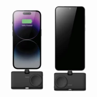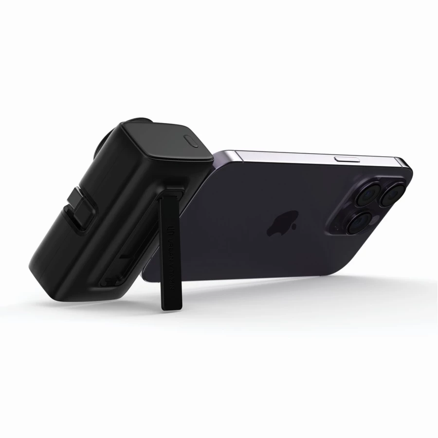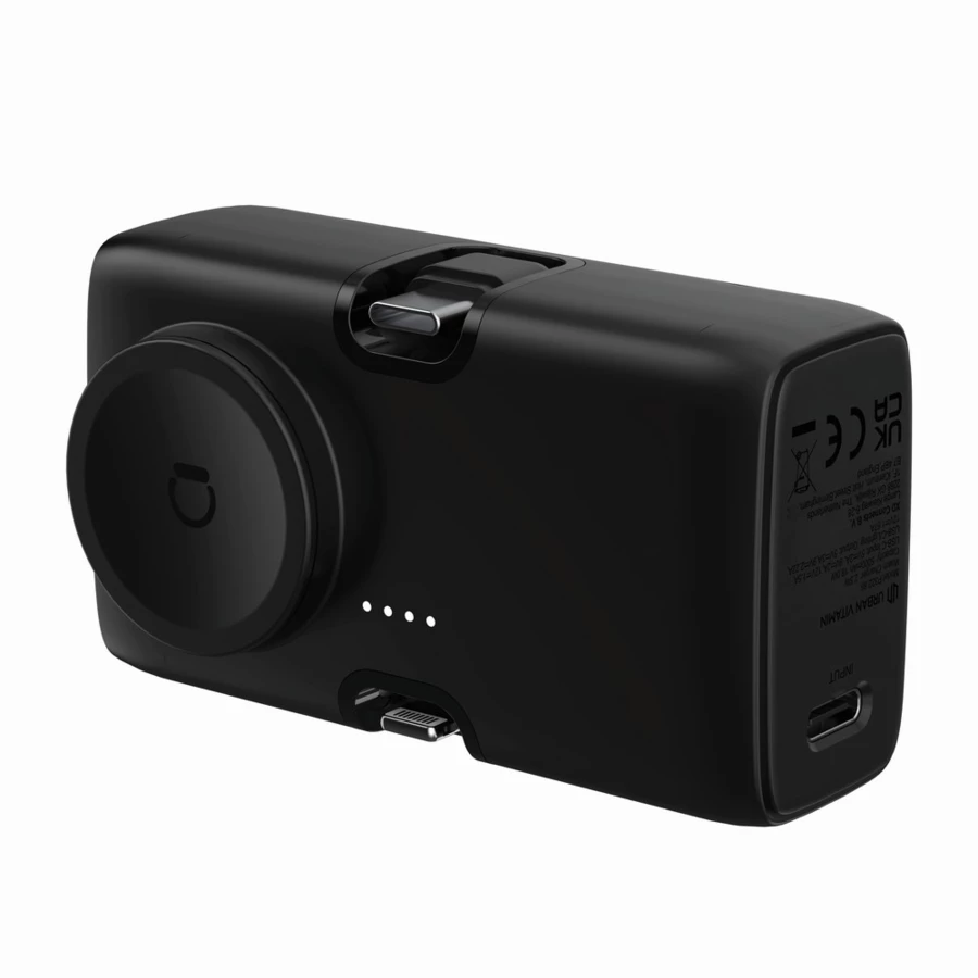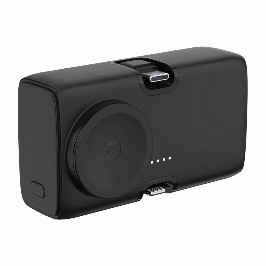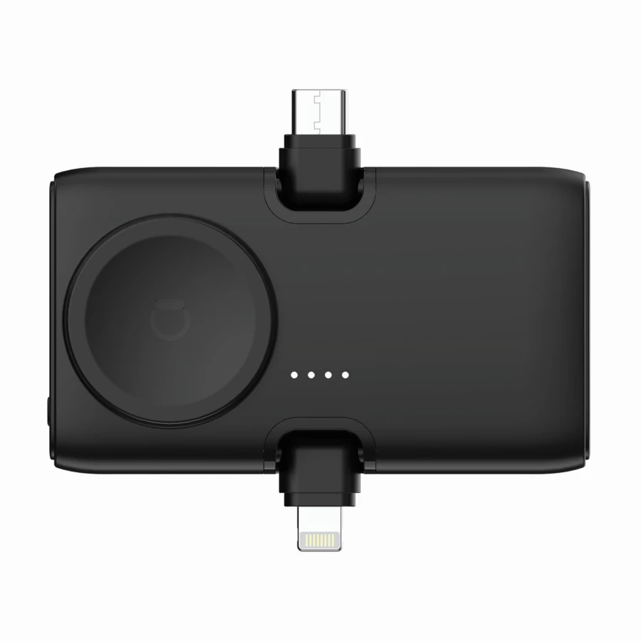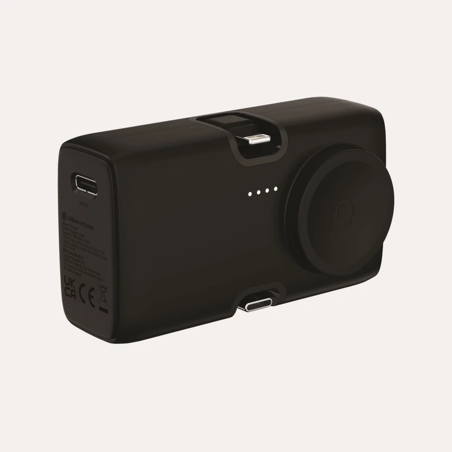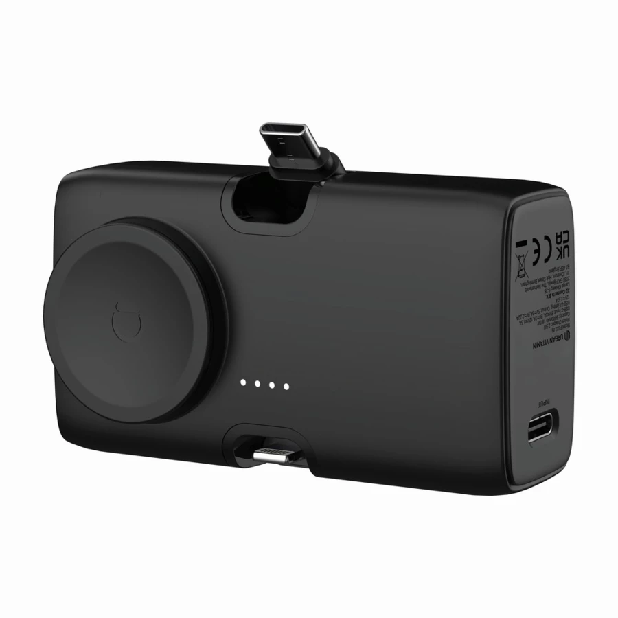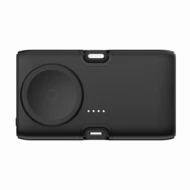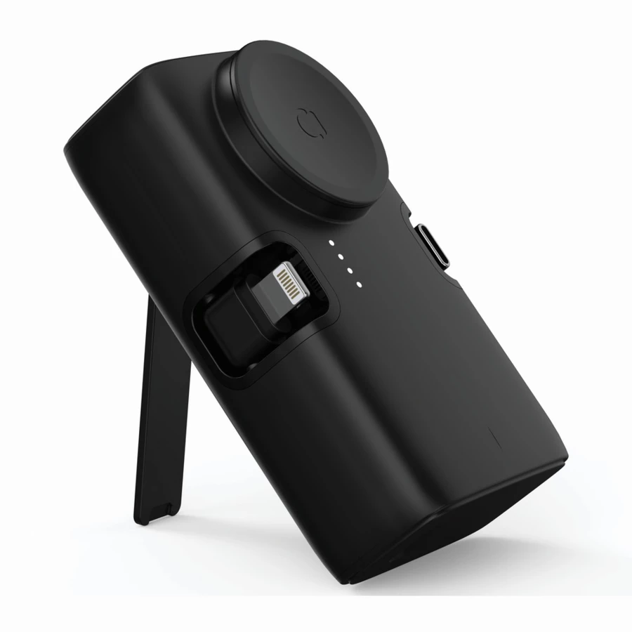 Power bank 5000 mAh, zintegrowana ładowarka bezprzewodowa do zegarka (tylko iOS), szybkie ładowanie do 20W, zintegrowane wyjścia USB-C i iOS, stojak na telefon, wyjście USB-C, działa z urządzeniami posiadającymi możliwość ładowania indukcyjnego, wykonana z ABS z recyklingu, całkowita zawartość materiałów z recyklingu obliczona na podstawie wagi całkowitej produktu: 24%