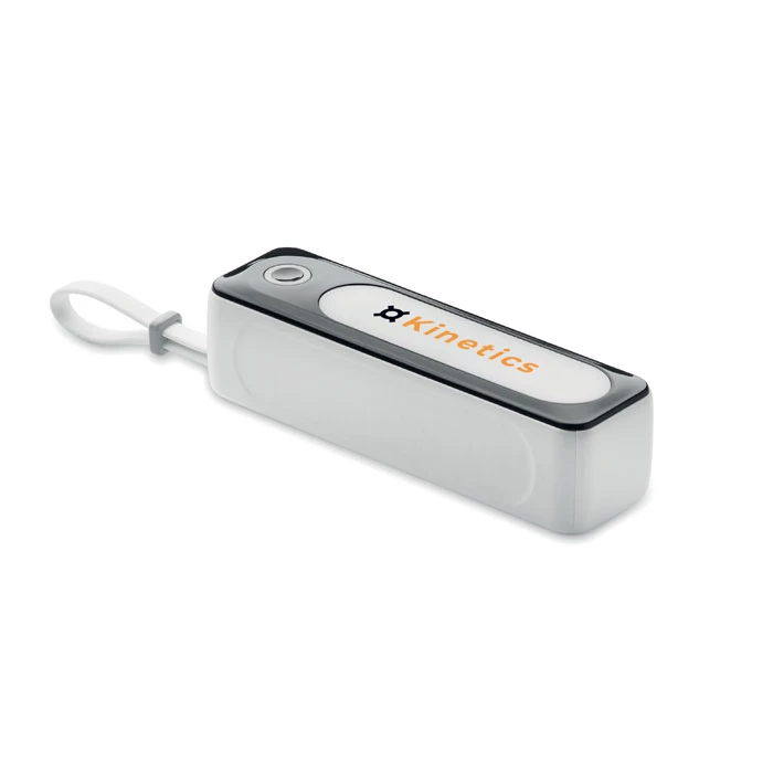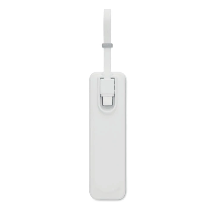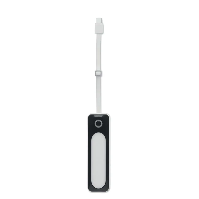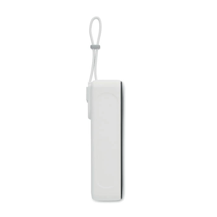 Power bank o pojemności 5000 mAh w obudowie ABS. Wyjście DC5V/2A 1x typ A i 1x typ C wejście/wyjście. Zawiera 4 wskaźniki świetlne (6 diod LED COB) i zintegrowany kabel USB z wtyczką typu C.