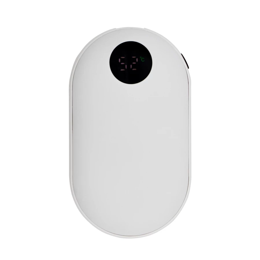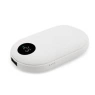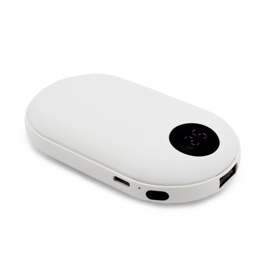 Power bank 5000 mAh, przód i tył posiada gumowe wykończenie, funkcja ogrzewania dłoni z 3 trybami intensywności (max. 42°C / max. 47°C / max. 52°C), wyjście USB 5V/2A, wejście USB-C 5V/2A, posiada cyfrowy wyświetlacz poziomu naładowania, czas działania funkcji ogrzewacza na 1 cyklu ładowania power banku: ok. 6h, kabel USB-C w komplecie, produkt wykonany z ABS
