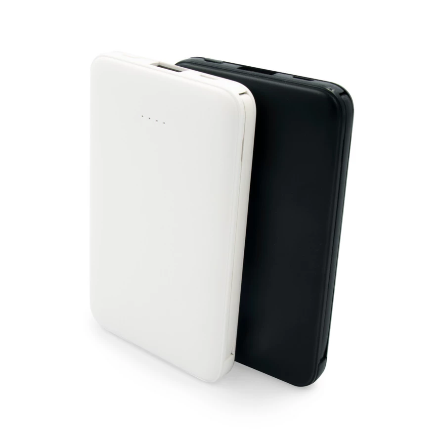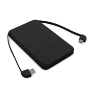 Power bank 5000 mAh z 2 zintegrowanymi kablami: USB-C oraz micro USB, w komplecie adapter z wejściem micro USB i końcówką kompatybilną z urządzeniami iOS, 4 diody wskazujące poziom naładowania, wejście micro USB, kabel micro USB w komplecie