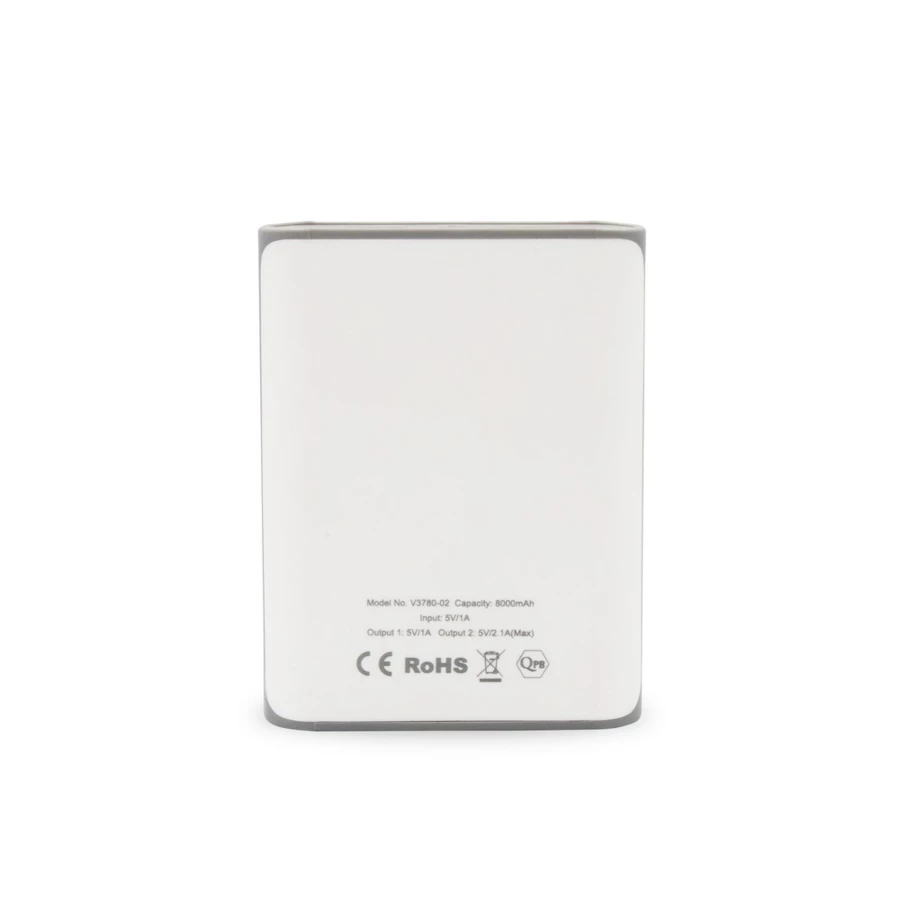Power bank 8000 mAh, wyjścia 5V/2.1A oraz 5V/1A, wejście 5V/1A, 5 diod wskazujących poziom naładowania, lampka LED, w komplecie kabel micro USB