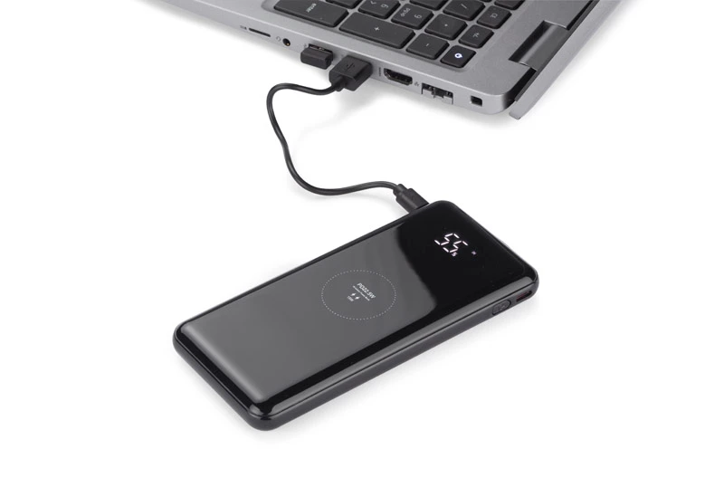FUERTE 15W to power bank, który posiada wiele nowoczesnych funkcji. Najważniejszą z nich jest funkcja szybkiego ładowania Power Delivery (PD). Jest to standard szybkiego ładowania umożliwiający przesyłanie dużych mocy przez złącze typu USB-C. Technologia charakteryzuje się zwiększonym poziomem mocy, w przypadku FUERTE jest to aż 15W. Największą zaletą standardu Power Delivery jest możliwość inteligentnego dostosowywania mocy ładowania do ładowanego urządzenia. Poza tym power bank posiada wbudowaną ładowarkę bezprzewodową o maksymalnej mocy 15W, cyfrowy wyświetlacz ukryty pod elegancką lustrzaną obudową i latarkę. Port USB-C jest dwukierunkowy – jest jednocześnie wejściem i wyjściem, co oznacza, że - łącznie z dwoma wyjściami USB-A – istnieje możliwość ładowania aż trzech urządzeń jednocześnie. Kabel do ładowania jest dołączony.