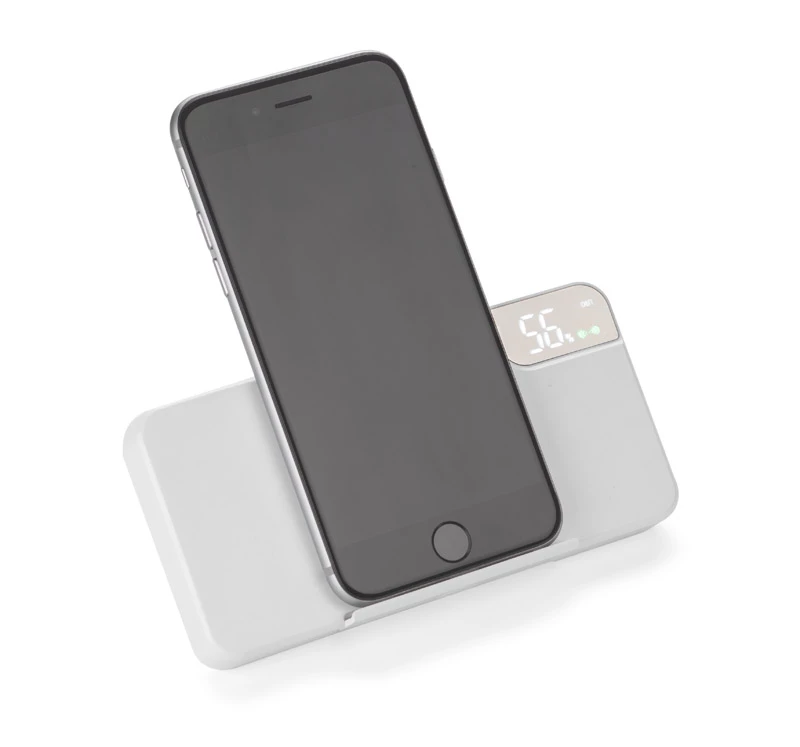 Power bank STAND wyróżnia się bardzo praktyczną funkcją stojaka na telefon. Poza tym posiada wbudowaną ładowarkę bezprzewodową o mocy 5W. Dzięki tym obu funkcjom można oglądać film na telefonie, jednocześnie ładując jego baterię bez żadnych kabli! Power bank wyposażony został również w cyfrowy wyświetlacz, który pokazuje aktualny poziom naładowania baterii i rodzaj ładowania. W zestawie standardowy kabel micro USB do ładowania. Produkt jest zgodny z odpowiednimi dyrektywami Unii Europejskiej, posiada znak CE oraz 1 rok gwarancji. Dane techniczne: wejście (micro USB i USB typu C) 5V/2A, wyjście USB 5V/2.1A (max), bateria litowo-polimerowa