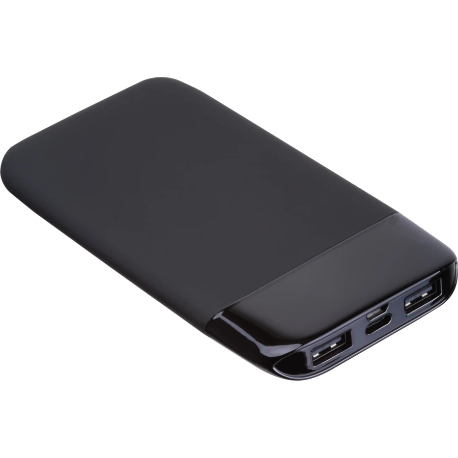 Power bank o pojemności 8 000 mAh z miękką, gumowaną powłoką oraz wyświetlaczem LCD. Power bank wyposażony w dwa wejścia USB i dwa USB-C, moc 5V 2 A. Logo zostanie wykonane metodą grawerunku laserowego i podświetlone wbudowanymi diodami LED.