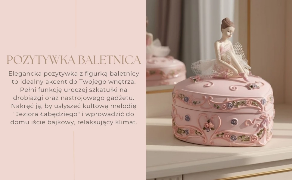Pozytywka w kształcie serca z figurką baletnicy to subtelny dodatek, który wprowadza do wnętrza ciepły, spokojny klimat. Delikatne zdobienia, pastelowe kolory i klasyczna melodia sprawiają, że to piękna dekoracja oraz praktyczne pudełeczko na drobiazgi. Idealna dla osób lubiących lekkie, eleganckie akcenty.