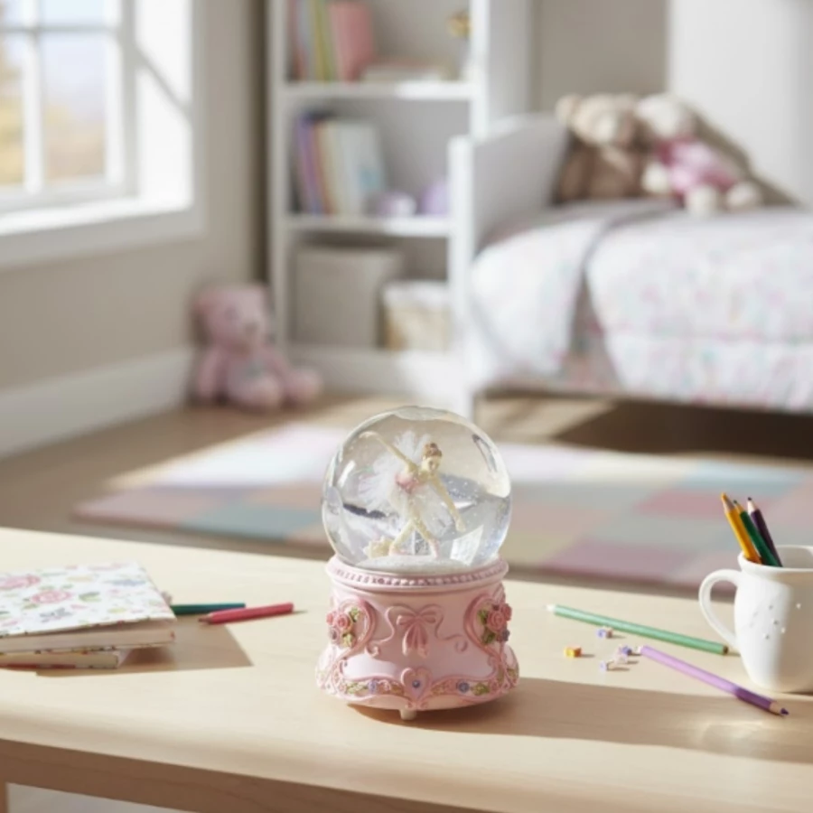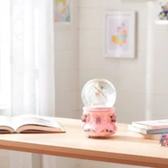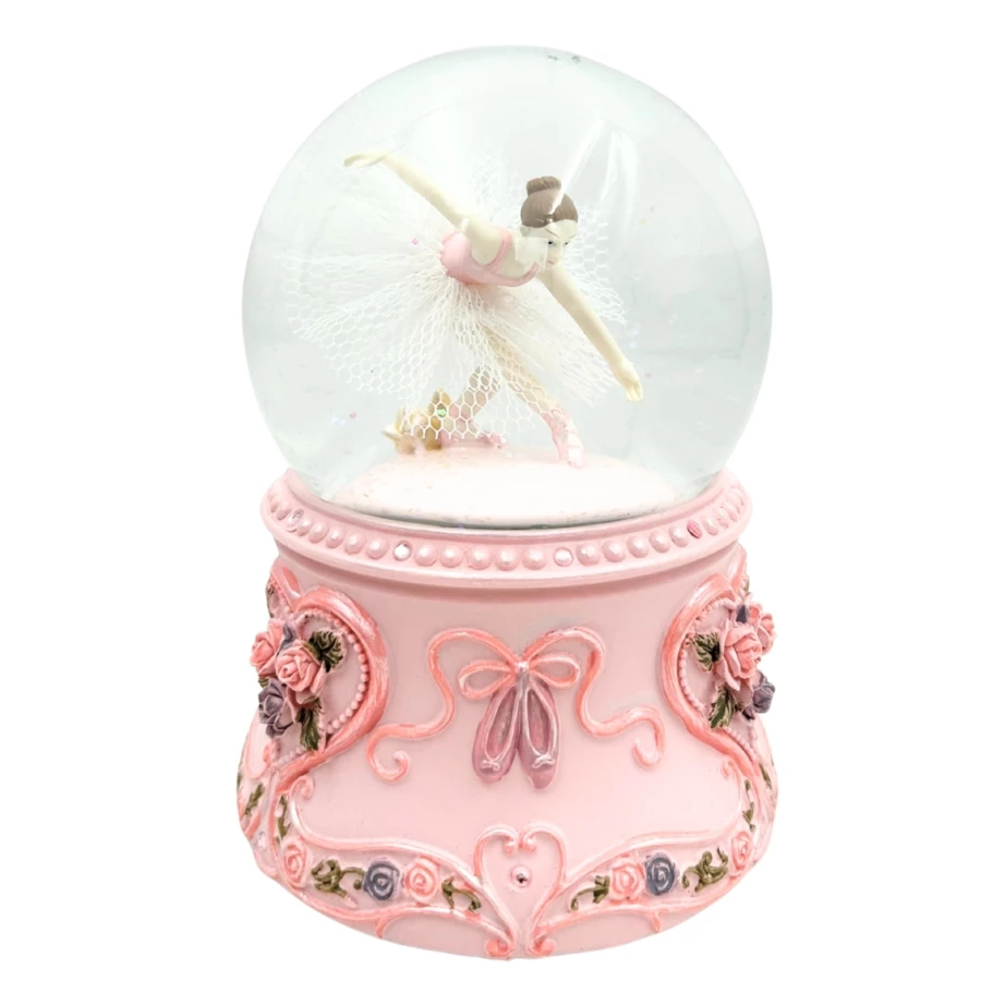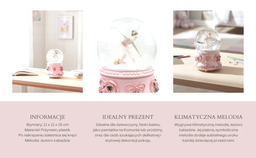 Pozytywka przedstawia balerinę tańczącą w szklanej kuli, osadzonej na eleganckiej, pastelowej podstawie z kwiatowymi zdobieniami. Po nakręceniu mechanizmu figurka obraca się, a delikatna melodia wypełnia przestrzeń spokojnym dźwiękiem. To doskonała dekoracja, która wnosi odrobinę magii do każdego wnętrza.