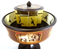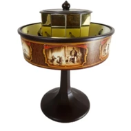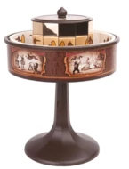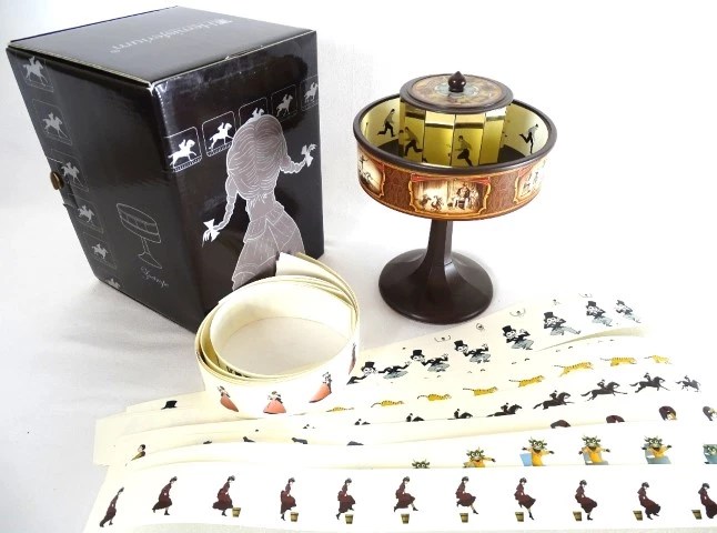 Praksinoskop H64 - mini, Urządzenie w formie bębna obrotowego, w którym znajduje się taśma z grafiką, co umożliwia widzenie ruchomego obrazu. Wynaleziony w 1877 roku przez francuskiego wynalazcę i pioniera techniki filmowej Émile'a Reynauda, był jednym z pierwszych przyrządów do pokazów kinematograficznych. Takie kino XIX wieku. Wspaniałe urządzenie edukacyjne pokazujące w jaki sposób ludzkość stopniowo dochodziła do stworzenia filmu. Wymiary wys. 19,5cm, śr. 14,2cm. 20 pasków emisyjnych czyli 20 "filmików" w komplecie. Pod tym linkiem film pokazujący sposób w jaki funkcjonuje praksinoskop: https://www.youtube.com/watch?v=ujaEqLrKAXE