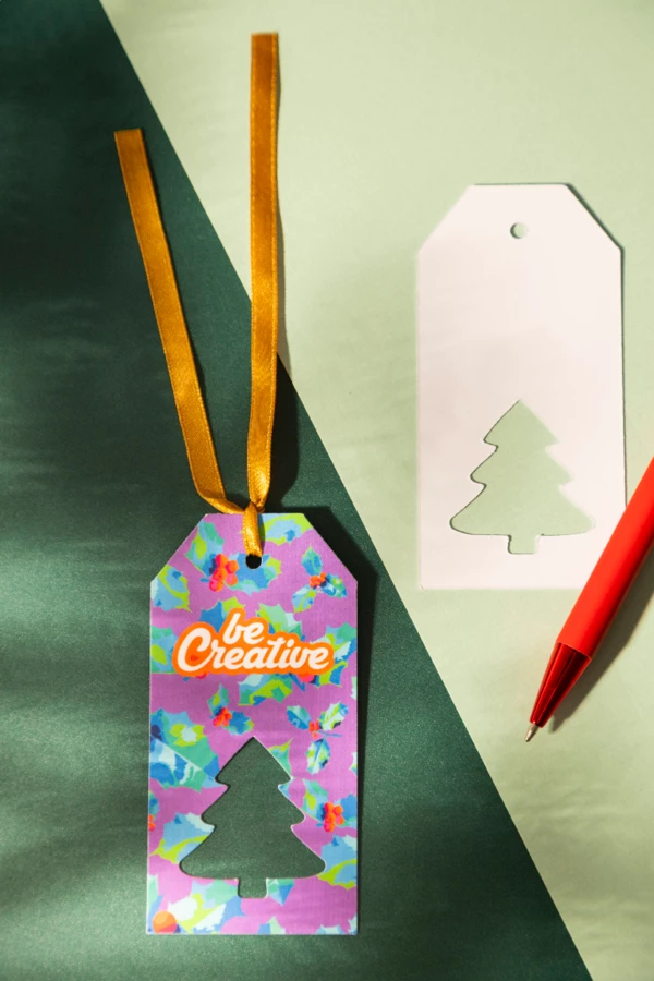 Personalizowana, kolorowa, papierowa zawieszka na prezent świąteczny z wyciętym motywem świątecznym i złotą wstążką. Cena zawiera nadruk cyfrowy z jednej strony. Min. ilość: 100 szt.