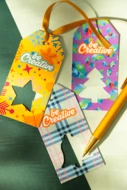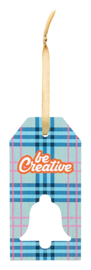 Personalizowana, kolorowa, papierowa zawieszka na prezent świąteczny z wyciętym motywem świątecznym i złotą wstążką. Cena zawiera nadruk cyfrowy z jednej strony. Min. ilość: 100 szt.