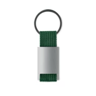 Prostokątny brelok ze stopu cynku i z kolorową plecioną taśmą z polyestru.