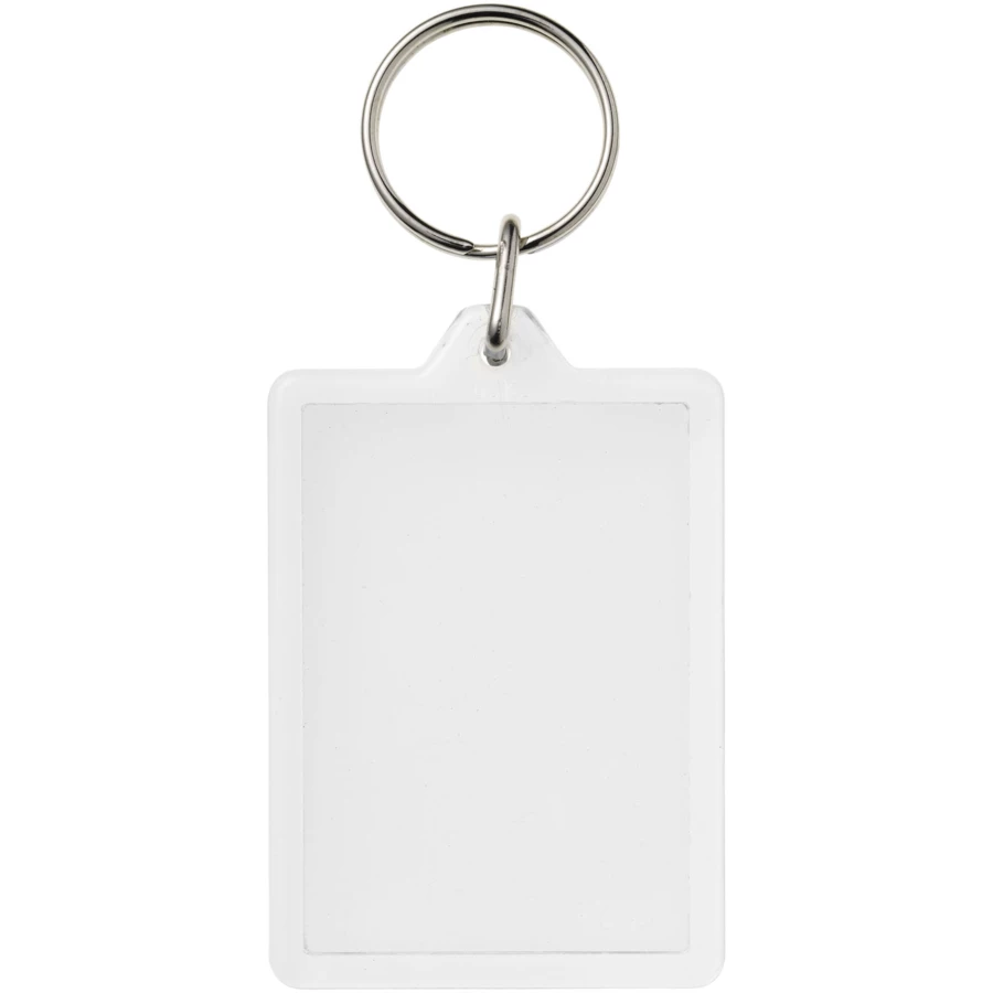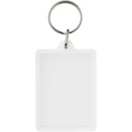 Prostokątny breloczek C1 z metalowym pękiem na klucze. Metalowy pierścień cechuje płaski profil, który idealnie nadaje się do wysyłek. Wymiary wkładu do druku: 5,0 cm x 3,5 cm.