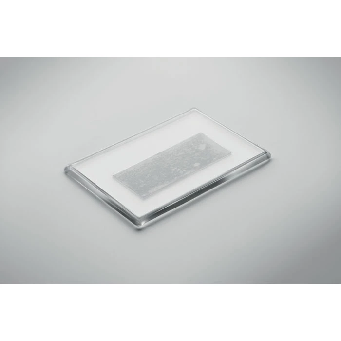 Prostokątny akrylowy uchwyt na zdjęcie z magnesem. Pasuje do wkładki fotograficznej o wymiarach 8,8 x 5,6 cm. Idealny jako pamiątka lub na rodzinne wspomnienia na lodówce.