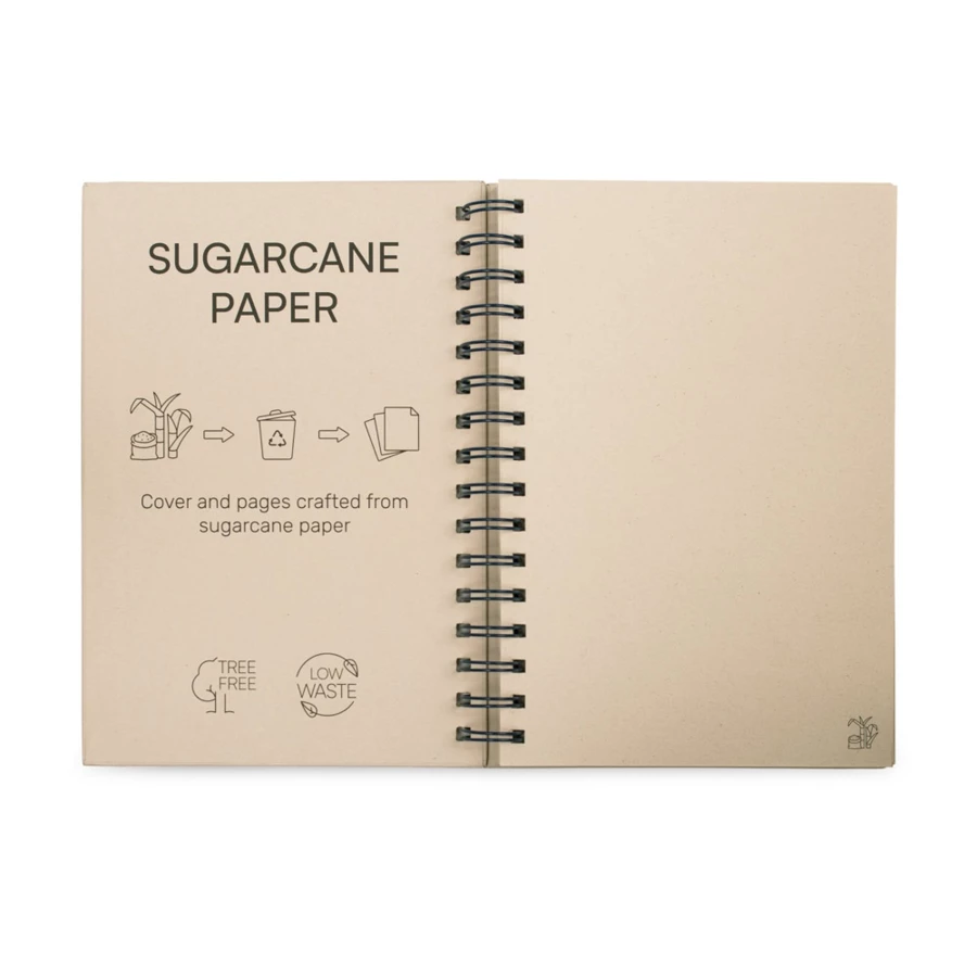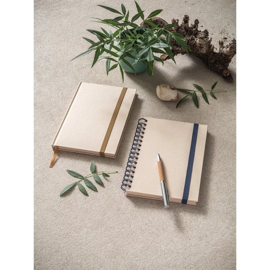 Notatnik A5 z ringami, twarda okładka, wykonany z papieru z trzciny cukrowej (80% trzciny cukrowej). Zawiera 160 gładkich kartek z papieru z trzciny cukrowej (80% trzciny cukrowej) (90 g/m²) i gumkę do zamykania notatnika. 147 x 214 mm