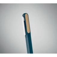 Obrotowy długopis z aluminiowym korpusem z recyklingu, częścią obrotową z recyklingowanego ABS i metalowym klipsem z bambusowym detalem. Niebieski tusz.