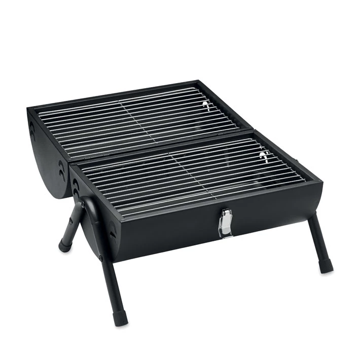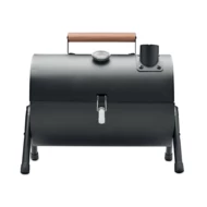 Przenośny grill żeliwny z kominem i wskaźnikiem temperatury. Palenisko malowane proszkowo na czarno. Zatrzask blokujący i drewniany uchwyt do przenoszenia.