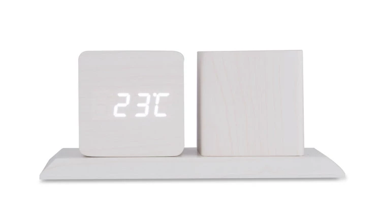 Organizer na biurko wykonany z płyty MDF o modnym wykończeniu w kolorze jasnego drewna, który świetnie pasuje do nowoczesnych pomieszczeń. Posiada pojemnik na długopisy oraz zegar z funkcjami: kalendarza, alarmu oraz termometru.