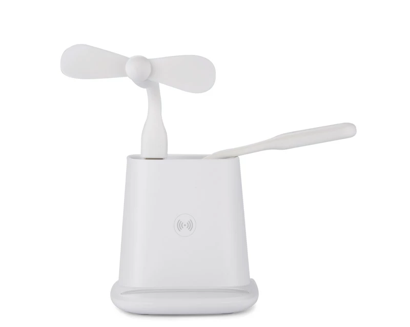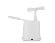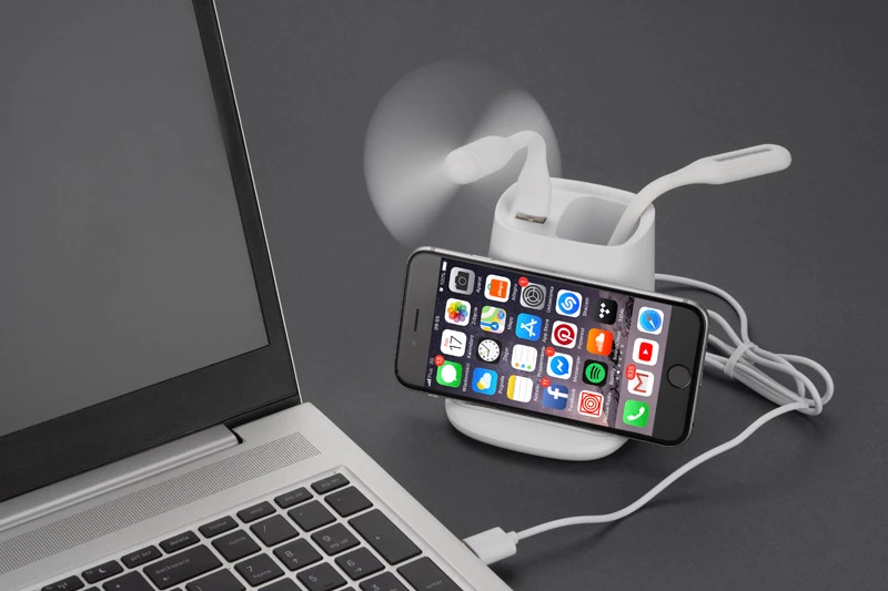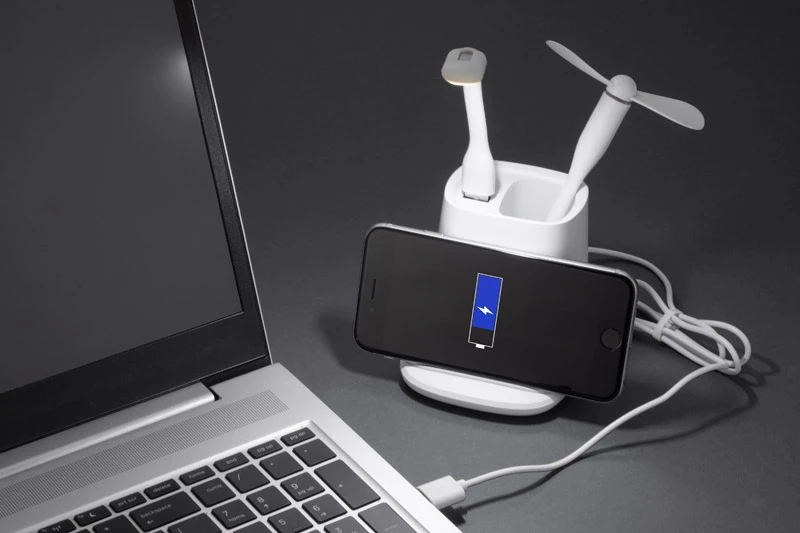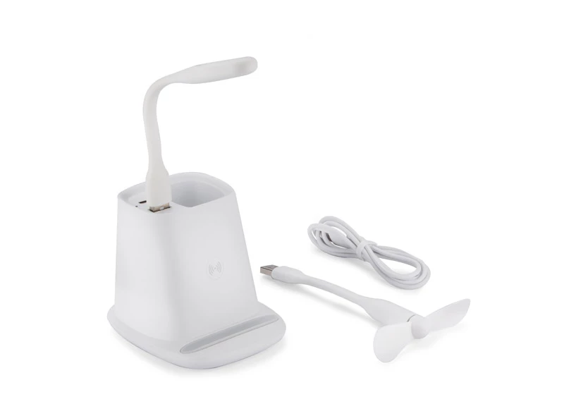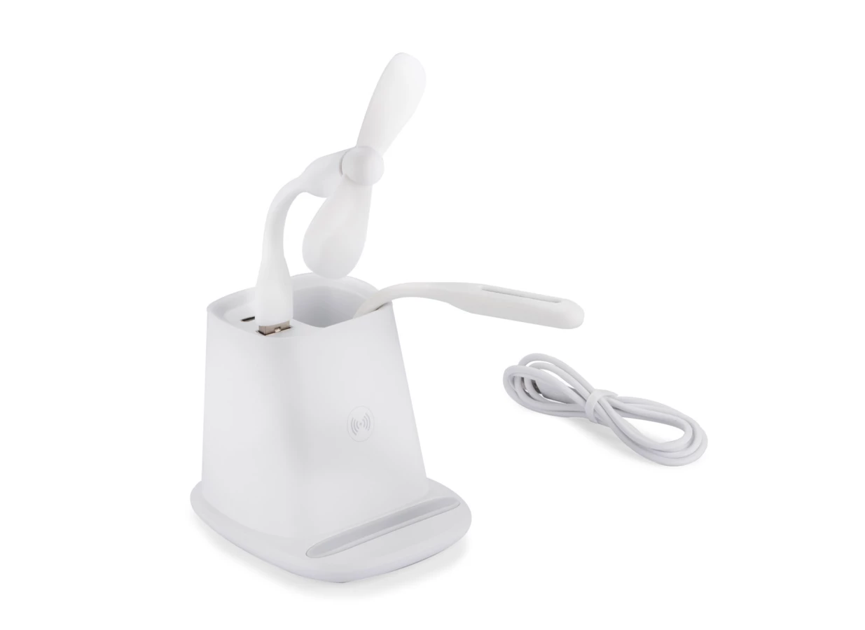 Przybornik na biurko BERGO to idealny gadżet do pracy przy biurku. Posiada on wbudowaną ładowarkę bezprzewodową, która służy również jako stojak do telefonu, jeden port USB, który zasili dołączone do produktu akcesoria: wiatraczek lub lampkę, a także port USB typu C, dzięki któremu za pomocą odpowiedniego kabla możemy naładować telefon. W przypadku niekorzystania z akcesoriów port USB może funkcjonować jako hub. Dane techniczne: wejście USB typu C: 5V/2A, wyjście ładowarki bezprzewodowej: 5W, 2 wyjścia: USB typu A i USB typu C: 5 V/2A (maks.)