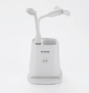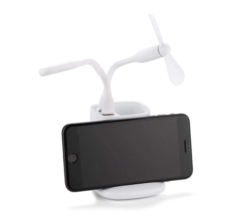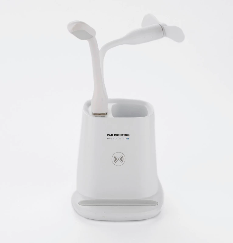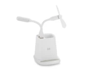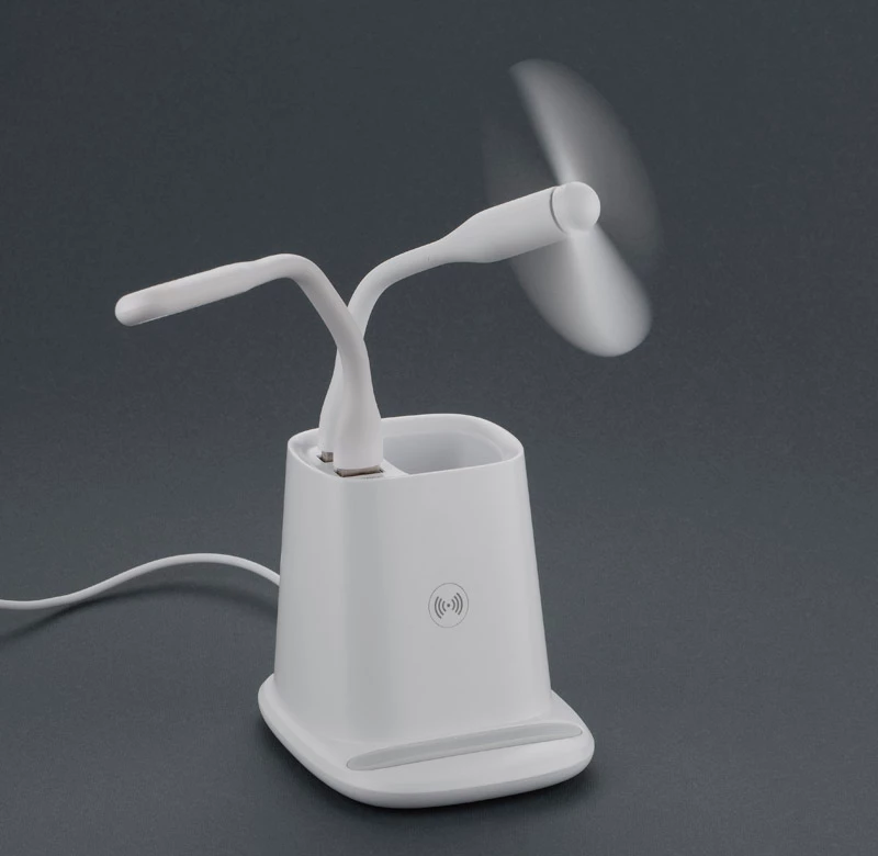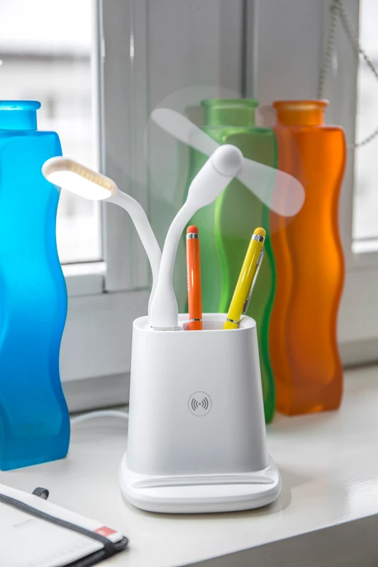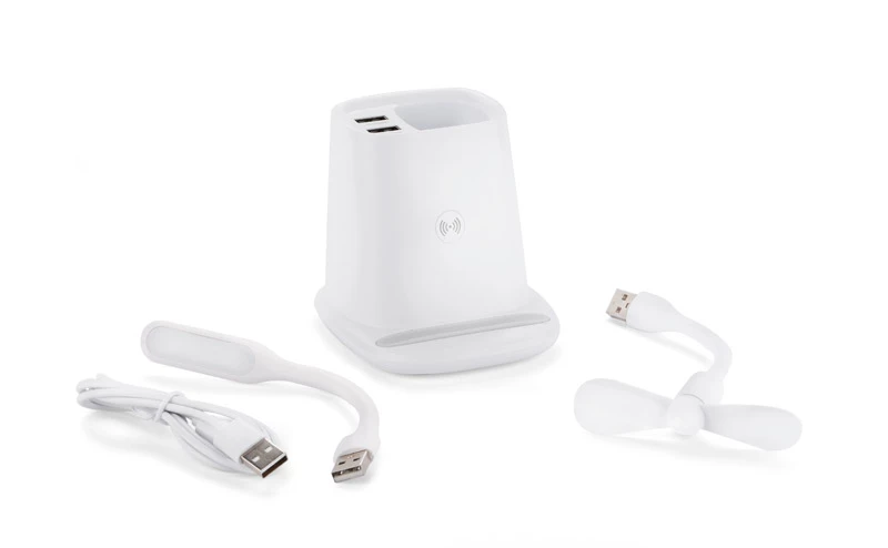 Przybornik na biurko BERGO to idealny gadżet do pracy przy biurku. Posiada on wbudowaną ładowarkę bezprzewodową, która służy również jako stojak do telefonu i dwa porty USB: USB-A który zasila dołączone do produktu akcesoria: wiatraczek i lampkę oraz USB-C, pozwalający łądować urządzenia elektroniczne. W przypadku niekorzystania z akcesoriów porty USB mogą funkcjonować jako hub. Dane techniczne: wejście USB-C: 5V/2A, wyjście ładowarki bezprzewodowej: 5W, 2 wyjścia USB: 5 V/2A (maks.)