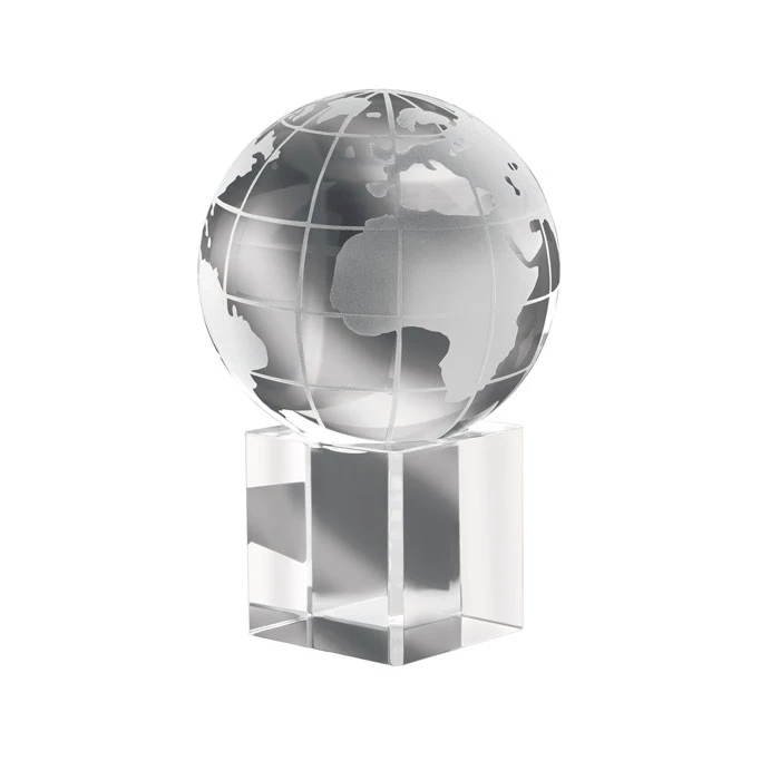 Kryształowy przycisk do papieru: kula ziemska na kryształowej podstawce. Pakowane w klasyczne ozdobne pudełko.