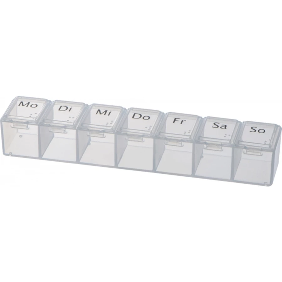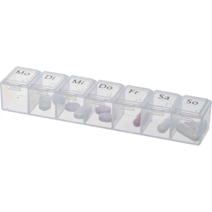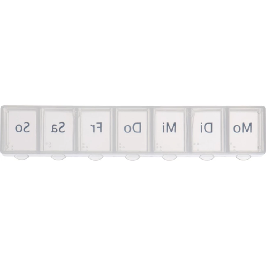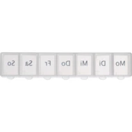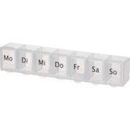 Pudełko na leki z 7 przegródkami na każdy dzień tygodnia. Dni tygodnia podane w języku niemieckim.